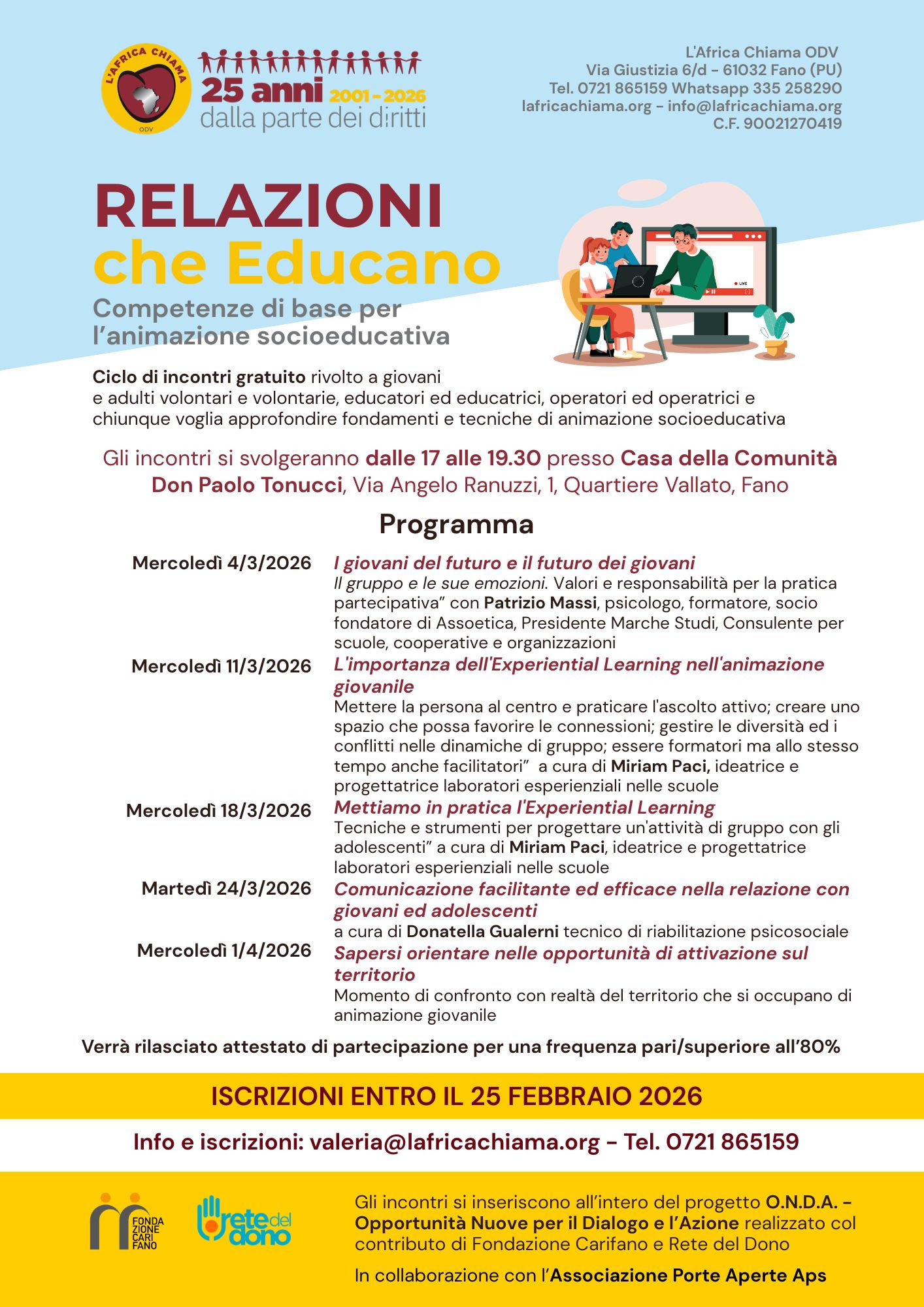 FANO – Rafforzare le competenze educative, valorizzare il ruolo delle relazioni e offrire strumenti concreti a chi opera con giovani e adolescenti: con questi obiettivi prende il via a Fano il ciclo di incontri gratuito “RELAZIONI CHE EDUCANO – Competenze di base per l’animazione socioeducativa”, promosso da L’Africa Chiama ODV.