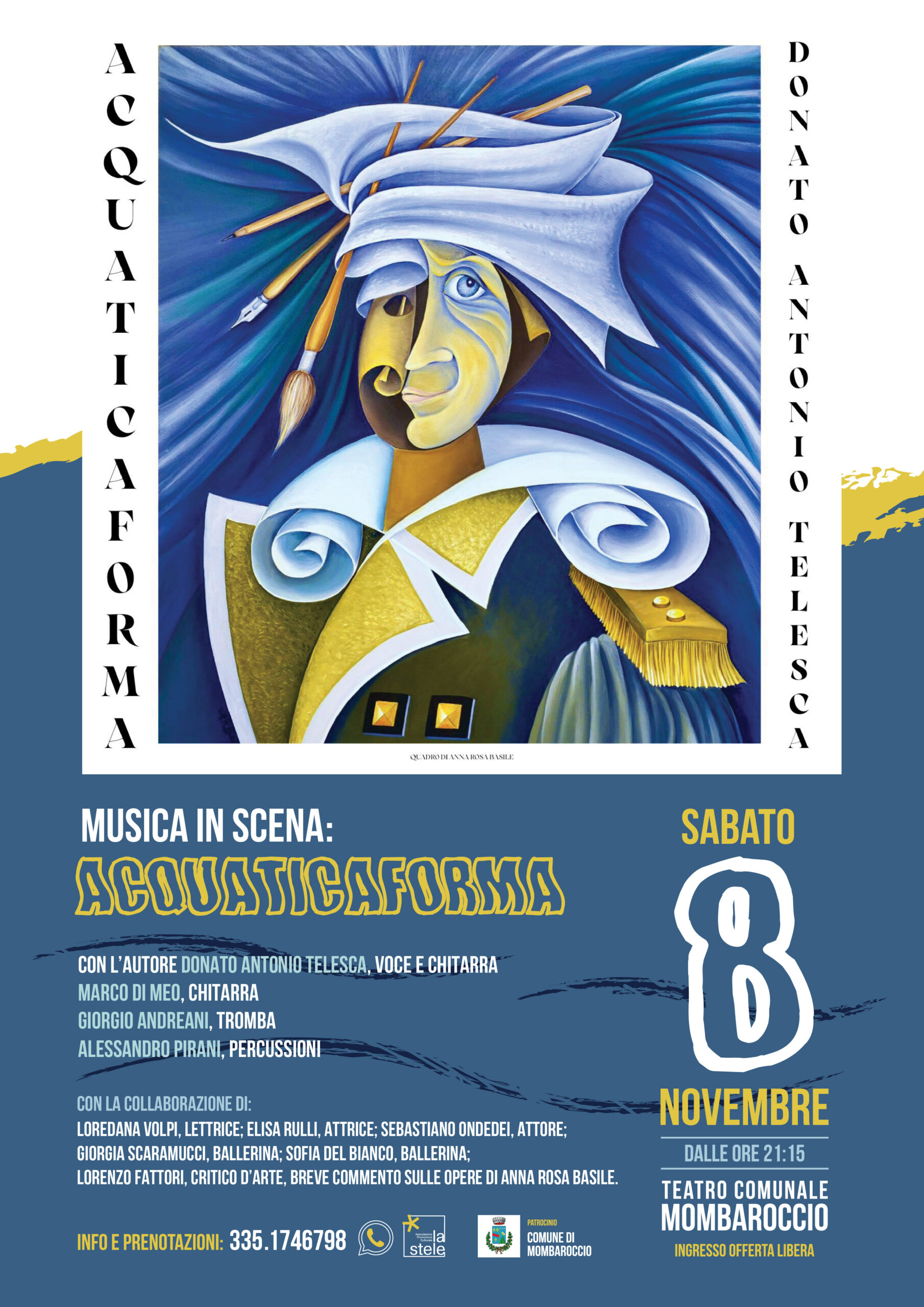 MOMBAROCCIO – Sabato 8 novembre alle ore 21,15 presso il Teatro comunale di Mombaroccio, si terrà il concerto con la presentazione dell’ultimo album del cantautore Donato Antonio Telesca dal titolo ACQUATICAFORMA. Una iniziativa promossa dall’Assessorato alla cultura del Comune di Mombaroccio e dall’Associazione culturale la Stele di Novilara.