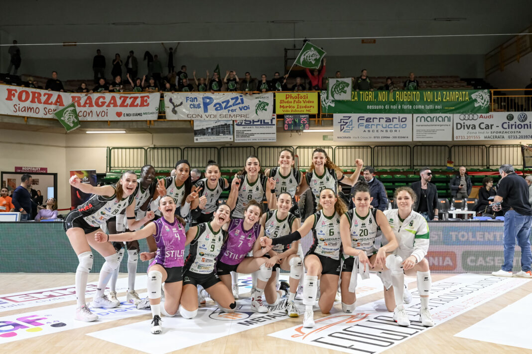 La Megabox Ondulati del Savio Vallefoglia coglie una cruciale vittoria in quattro set sul campo delle cugine della CBF Balducci Macerata e blinda in questo modo il sesto posto: a tre giornate dalla fine della stagione regolare, con nove lunghezze e sei vittorie di vantaggio su Bergamo, settima, le biancoverdi sono ormai irraggiungibili. Tigri sempre avanti in tutti e quattro i set, ma nel secondo, sul 21-16, un improvviso passaggio a vuoto ha consentito alle padrone di casa un parziale di 9-2 che ha rimesso temporaneamente in equilibrio la partita. Da lì in poi, la Megabox è tornata a condurre le operazioni e ad aggiudicarsi gli altri due parziali. Vittoria meritata, con sprazzi di bel gioco nonostante un totale di 38 errori. Bici mvp con 23 punti, il 50% in attacco e 4 ace, bene anche Candi (11 punti con 4 muri) e ancora una volta preziosa Ungureanu dalla panchina (9 punti). Nella CBF Balducci, stoica Decortes, che si è caricata la squadra sulle spalle attaccando 50 palloni e chiudendo con 23 punti. Nel primo set il break arrivava sull’8-5 (ace di Bici e due punti in fila di Butigan. Un attacco out di Kockarevic faceva scivolare la CBF a -4 (6-10), ma la partita tornava quasi in equilibrio sul 10-11 (doppia di Bartolucci).Un ace di Omoruyi e un attacco out di Clothier ristabilivano le distanze, un muro di Giovannini siglava il +5 per le tigri (17-12). Decortes murava Omoruyi per il nuovo -3, ci pensava Bici a chiudere i discorsi con gli ultimi due attacchi per il 25-20 finale.
