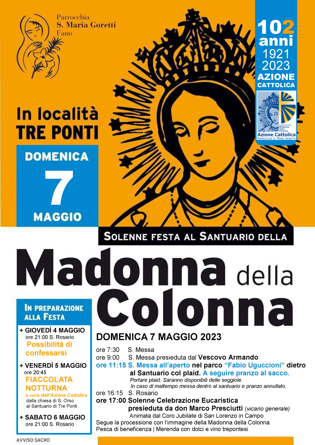 Sante Messe ore 7.30, 9.00 presieduta dal Vescovo Armando, 11.15, ore 16.15 recita del Santo Rosario. In occasione della S. Messa delle 11:15 l’Azione Cattolica celebrerà il centenario della sua nascita avvenuta nel 1921 presso il Santuario della Colonna. La messa verrà celebrata nel parco del santuario “Fabio Uguccioni”. Seguirà poi un pranzo pic-nic aperto a tutta la cittadinanza. Si consiglia di portare il plaid. In caso di maltempo la messa sarà celebrata all’interno e il pranzo verrà annullato. Non saranno celebrate le S. Messe delle ore 11:15 e 18 nella chiesa parrocchiale.
