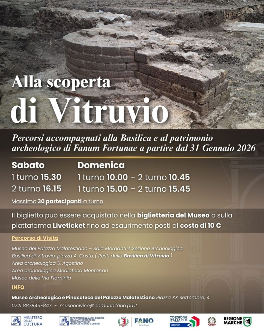 «Questa non è una semplice visita: è un viaggio nella nostra identità – dichiara il Sindaco di Fano, Luca Serfilippi –. La Basilica di Vitruvio, insieme al patrimonio archeologico diffuso della città, ci offre un’occasione straordinaria per raccontare Fano al mondo con la forza della sua storia e della sua bellezza. Invitiamo cittadini e visitatori a partecipare: per la prima volta, dopo duemila anni, abbiamo la possibilità di avvicinarci a un valore che appartiene a tutti».
