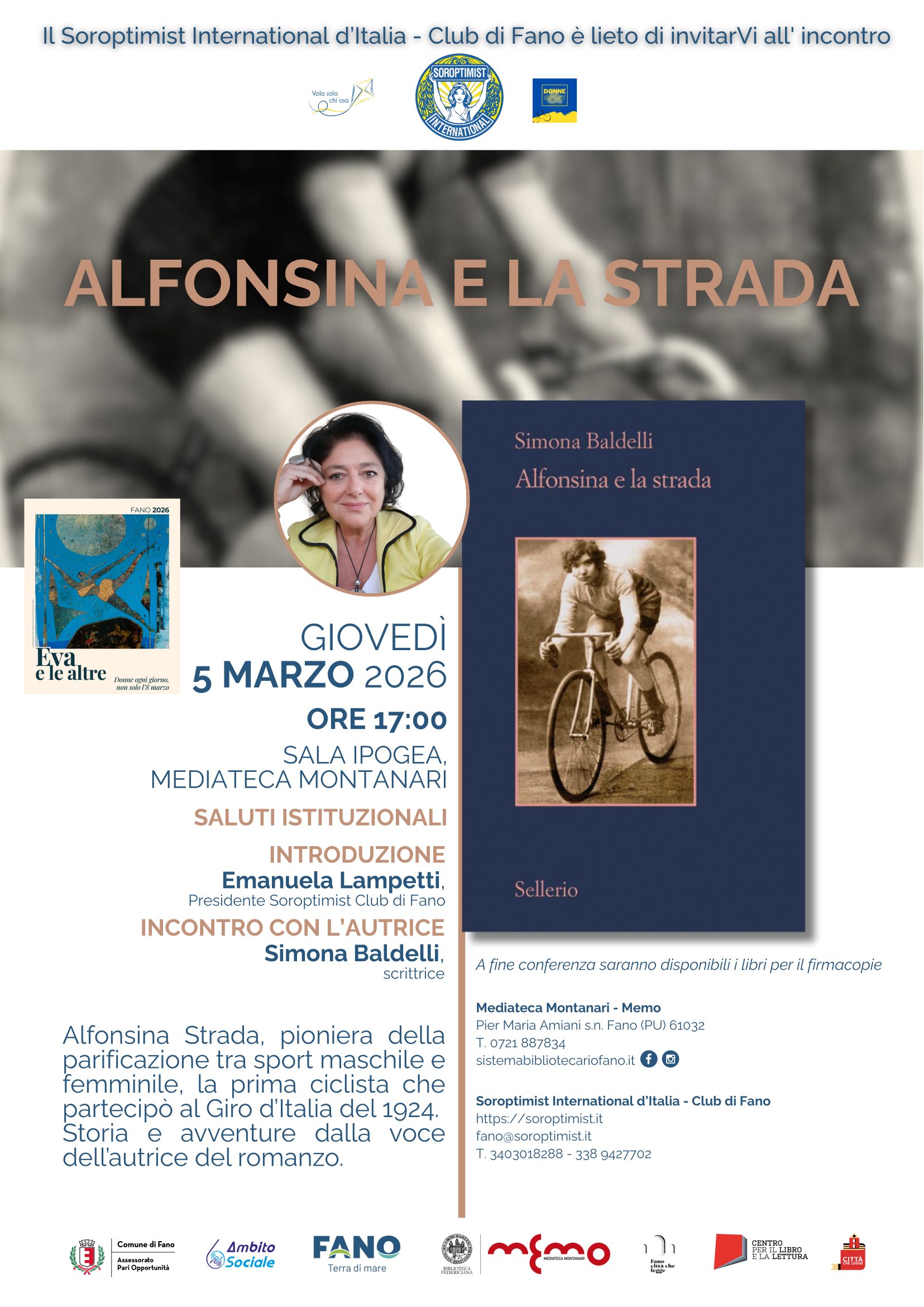 Con la conferenza su Alfonsina il Soroptimist di Fano si inserisce nel cartellone dell’Assessorato Pari Opportunità “Eva e le Altre” che riunisce e coordina le iniziative di varie Associazioni sul tema della donna, che si svolgeranno nel mese di marzo e successivi”.