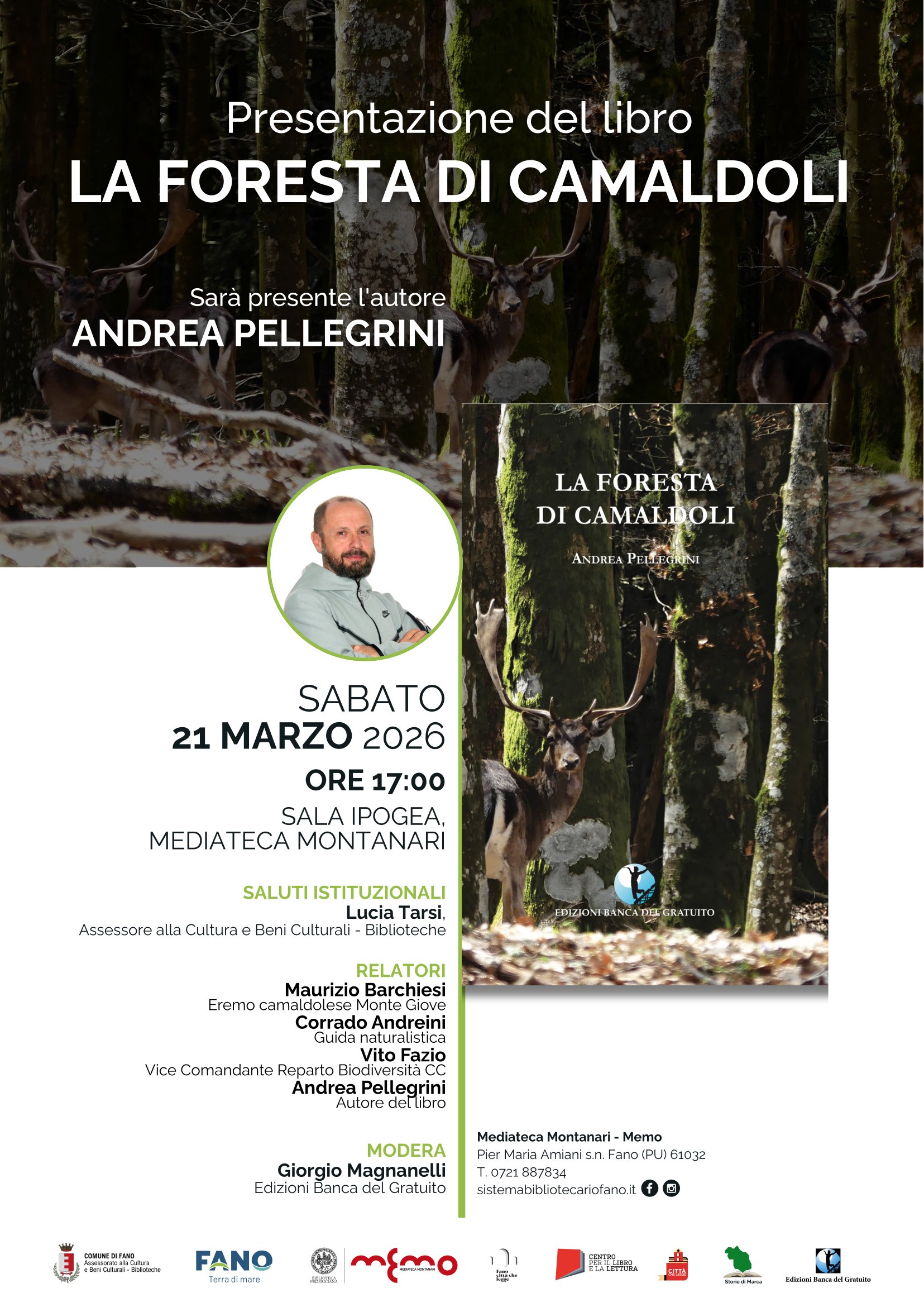 FANO – Sabato 21 marzo alle ore 17, presso la Sala ipogea della Mediateca Montanari-Memo di Fano verrà presentato il libro di Andrea Pellegrini – guida naturalistica ed ambientale – “La foresta di Camaldoli”, Edizioni Banca del Gratuito, con la partecipazione, insieme all’autore, di Lucia Tarsi, Assessore alla cultura del Comune di Fano, Maurizio Barchiesi, monaco camaldolese di Monte Giove, Corrado Andreini, guida naturalistica del Casentino e Vito Fazio, Vice Comandante del Reparto biodiversità dei Carabinieri. Coordina l’incontro Giorgio Magnanelli delle Edizioni Banca del Gratuito.