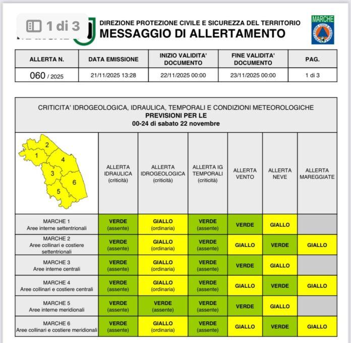 MARCHE – La Protezione Civile delle Marche ha emesso un’allerta meteo gialla valida per tutta la giornata di sabato 22 novembre, a causa del peggioramento delle condizioni atmosferiche legato alla formazione di una bassa pressione sul basso Adriatico.