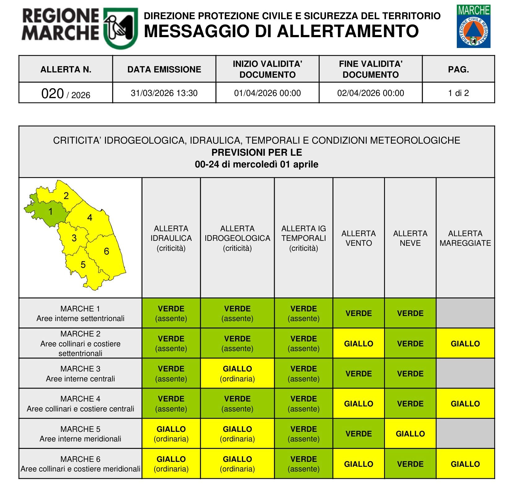 MARCHE – Nuova allerta meteo nelle Marche per la giornata di domani, 1° aprile. Un minimo depressionario sul Tirreno meridionale porterà flussi umidi da sud-est, con precipitazioni diffuse e ventilazione sostenuta, soprattutto lungo la costa, dove il mare sarà molto mosso o agitato.