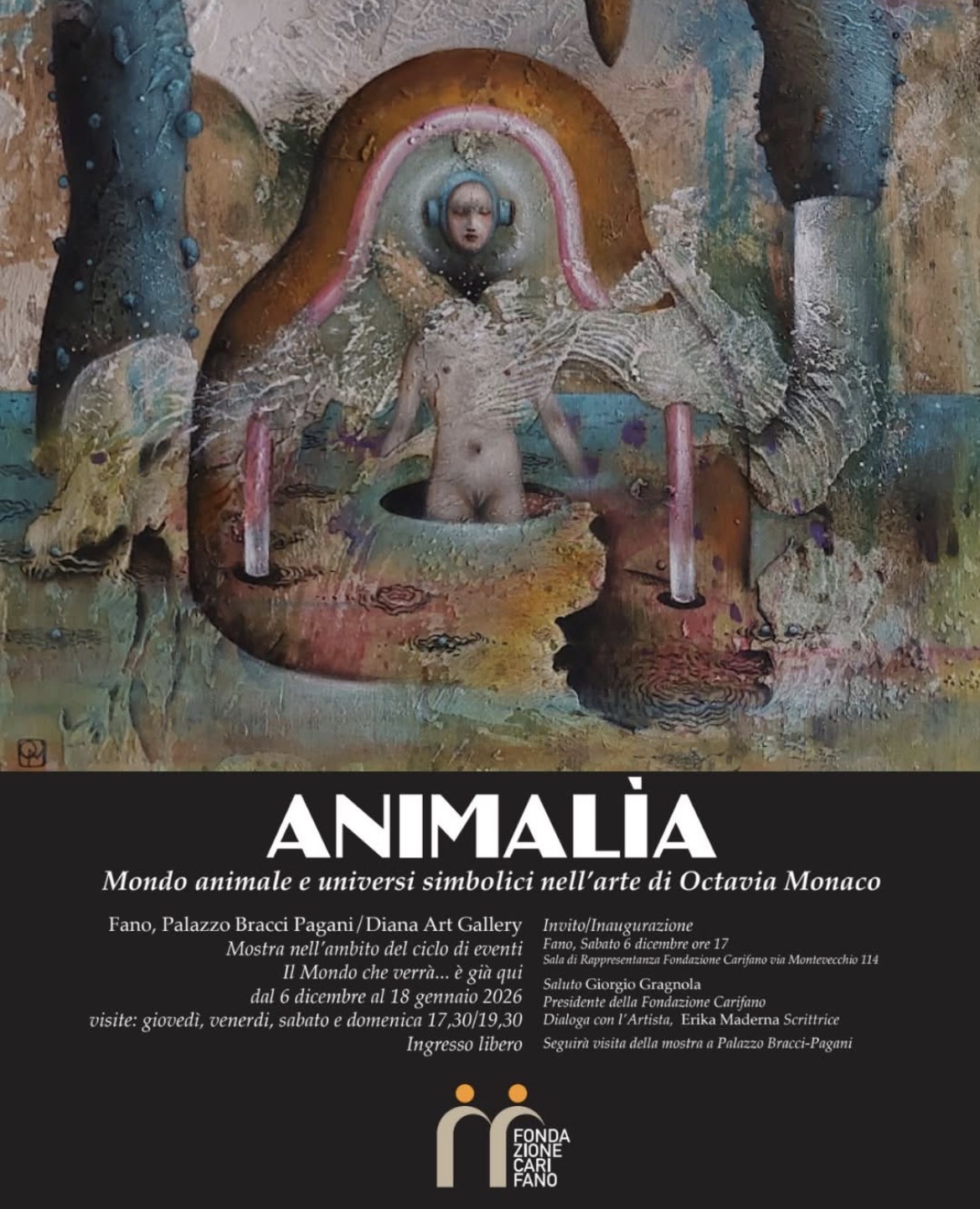 FANO – Il viaggio simbolico e visionario di Octavia Monaco arriva a Fano con “Animalìa. Mondo animale e universi simbolici nell’arte di Octavia Monaco”, una mostra che la Fondazione Carifano propone all’interno del ciclo culturale “Il Mondo che verrà… è già qui”, dedicato alle trasformazioni del presente e ai linguaggi che sanno raccontarle.