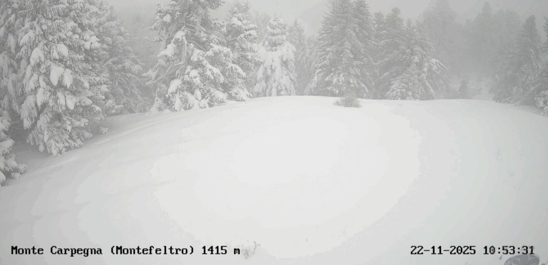 PESARO – La neve è arrivata puntuale nelle aree interne delle Marche, mentre sulla costa la giornata si è aperta con piogge intense e persistenti. La coltre bianca ha già attecchito nelle principali località montane e collinari: imbiancate le stazioni sciistiche di Sarnano, Bolognola, Frontignano e Monte Catria. Nevicate in corso anche sul Monte Carpegna, ad Acquaviva di Cagli e in diverse località dell’entroterra maceratese, tra cui Cingoli, Camerino, Matelica, Castelraimondo, Acquacanina e Serrapetrona. Un quadro invernale diffuso che interessa gran parte dell’Appennino marchigiano. La Protezione civile regionale, in una nota diffusa questa mattina, segnala che «la formazione di un minimo depressionario nel basso Adriatico consentirà l’ingresso di aria fredda nella regione, con precipitazioni diffuse e persistenti, a carattere nevoso al di sopra dei 300 metri e intensa ventilazione da nord-est lungo la costa, con conseguente stato del mare molto mosso». Secondo le previsioni, oltre i 600 metri le nevicate saranno insistenti per tutta la giornata. Tra i 300 e i 600 metri le precipitazioni resteranno piovose o miste fino alla tarda mattinata, per poi virare gradualmente in neve entro il mezzogiorno. A complicare ulteriormente il quadro meteorologico è il vento di Bora, che sta soffiando con raffiche fino a burrasca. Le condizioni più critiche sono attese tra la tarda mattinata e il pomeriggio sulla costa centro-meridionale, dove le raffiche potranno raggiungere intensità elevate prima di una parziale attenuazione nella seconda parte della giornata.