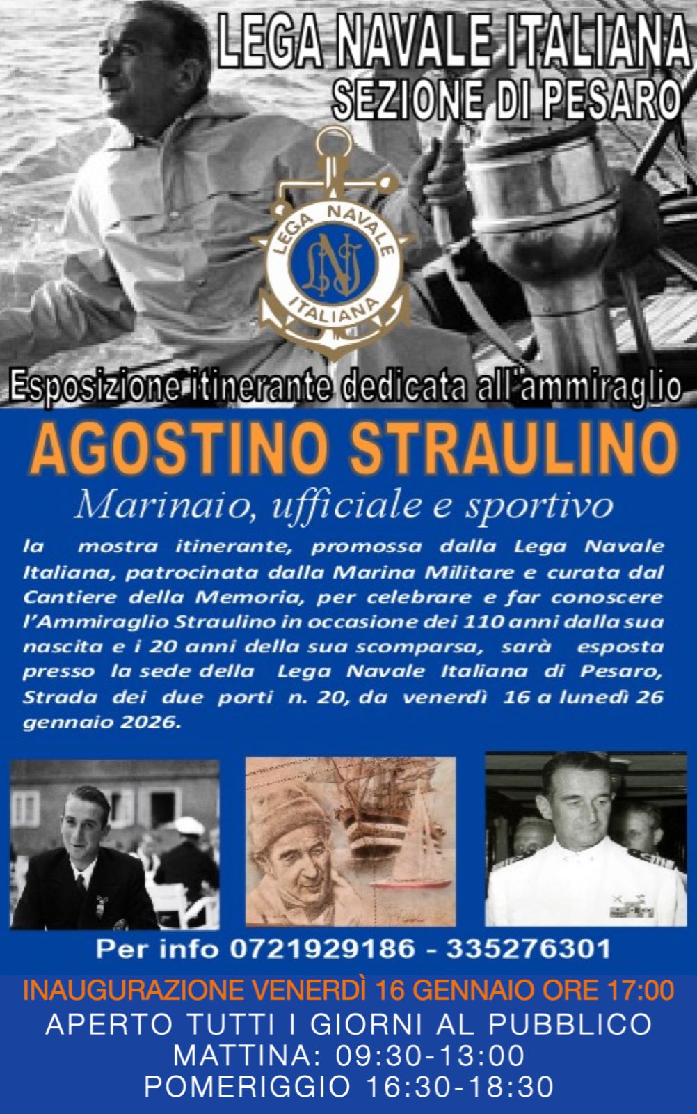 PESARO – Approda a Pesaro la mostra itinerante sul comandante Agostino Straulino, promossa dalla Lega Navale Italiana e patrocinata dalla Marina Militare che ha già toccato 12 città sul territorio nazionale. Curata dal Cantiere della Memoria per celebrare e far conoscere l’Ammiraglio Straulino, a 110 anni dalla sua nascita e a 20 anni dalla sua scomparsa, sarà esposta nella sede della Lega Navale di Pesaro (in Strada tra i Due Porti n.20) da venerdì 16 a lunedì 26 gennaio. Dopo l’inaugurazione, che avverrà venerdì 16 gennaio alle ore 17, la mostra rimarrà aperta al pubblico tutti i giorni, il mattino dalle 9.30 alle 12.30 e il pomeriggio dalle 16.30 alle 18.30.