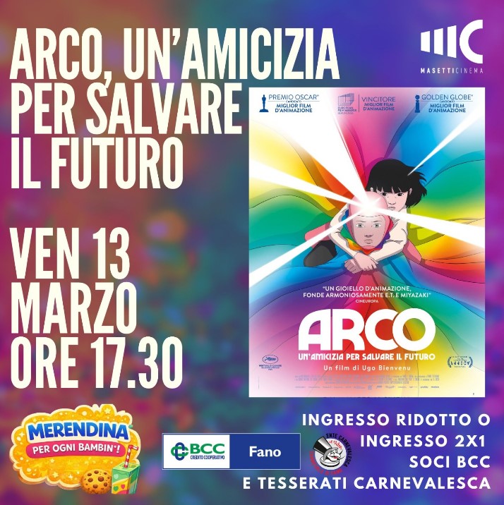 FANO – I venerdì animati del Masetti proseguono il 13 marzo con Arco – Un’amicizia per salvare il futuro, un film d’animazione diretto da Ugo Bienvenu e Gilles Cazaux che racconta la storia di un bambino di dieci anni, Arco appunto. Curioso e intraprendente, egli vive in un futuro lontano dove è possibile viaggiare nel tempo. Durante il suo primo volo di prova con una speciale tuta arcobaleno, qualcosa però va storto: Arco perde il controllo e precipita nel 2075. Nel cielo limpido di quel giorno, Iris, una sua coetanea, vede una scia luminosa solcare l’orizzonte: è proprio Arco, che atterra come un fulmine colorato. Incuriosita, Iris lo raggiunge e scopre che quel misterioso ragazzo arriva da un’epoca lontana. La bambina decide allora di aiutare il suo nuovo amico a tornare a casa nel futuro. Tra avventure, ostacoli tecnologici e viaggi nel tempo, i due bambini scoprono che a volte, per non perdersi, bisogna prima imparare a conoscersi.