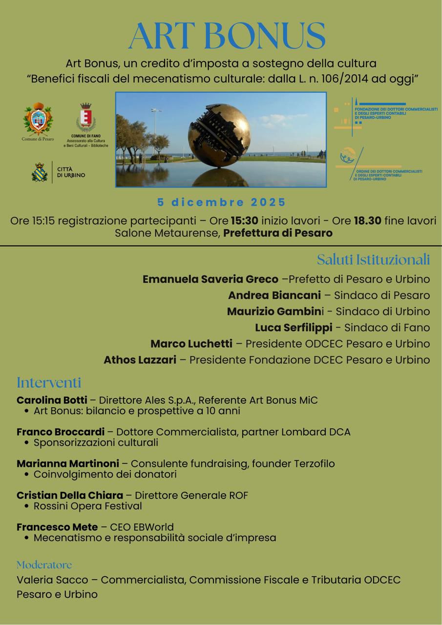 PESARO – Si intitola “Art Bonus, un credito d’imposta a sostegno della cultura” il convengo in programma venerdì 5 dicembre, alle 15.30, presso il Salone Metaurense della Prefettura di Pesaro ed organizzato dalla Fondazione e dall’Ordine dei Commercialisti di Pesaro e Urbino. Un appuntamento dedicato al tema dei benefici fiscali del mecenatismo culturale, durante il quale si terrà un importante approfondimento sulle norme esistenti in materia, dal 2014 fino ai giorni nostri, sottolineando le opportunità che possono cogliere imprese, cittadini e mondo della cultura. L’Art Bonus rappresenta infatti un esempio virtuoso di come la fiscalità possa diventare anche una leva di sviluppo culturale e territoriale, avendo anche un forte impatto sulla società. L’evento si aprirà con i saluti istituzionali di Emanuela Saveria Greco, Prefetto di Pesaro e Urbino e quello dei tre sindaci dei Comuni che patrocinano l’evento: Andrea Biancani, sindaco di Pesaro; Maurizio Gambini, sindaco di Urbino e Luca Serfilippi, sindaco di Fano. A seguire, interverranno Marco Luchetti, presidente dell’Ordine dei Commercialisti di Pesaro e Urbino e Athos Lazzari, presidente della Fondazione dei Dottori Commercialisti. Cinque i temi che saranno affrontati durante l’incontro, che sarà moderato da Valeria Sacco, commercialista e membro della Commissione fiscale e tributaria dell’Ordine. A parlare di “Art Bonus: bilancio e prospettive a 10 anni” sarà Carolina Botti, direttore di Ales Spa e referente Art Bonus del Mic. A seguire, affrontando il tema delle sponsorizzazioni culturali, interverrà Franco Broccardi, commercialista e partner di Lombard DCA. Marianna Martinoni, consulente fundraising e founder di Terzofilo, parlerà del coinvolgimento dei donatori in questa tipologia di attività, mentre Cristian Della Chiara, direttore generale del Rossini Opera Festival parlerà appunto del Rof, uno degli eventi culturali più importanti del panorama internazionale. A chiudere la giornata sarà Francesco Mete, Ceo di EBWorld che parlerà di mecenatismo e responsabilità sociale d’impresa.