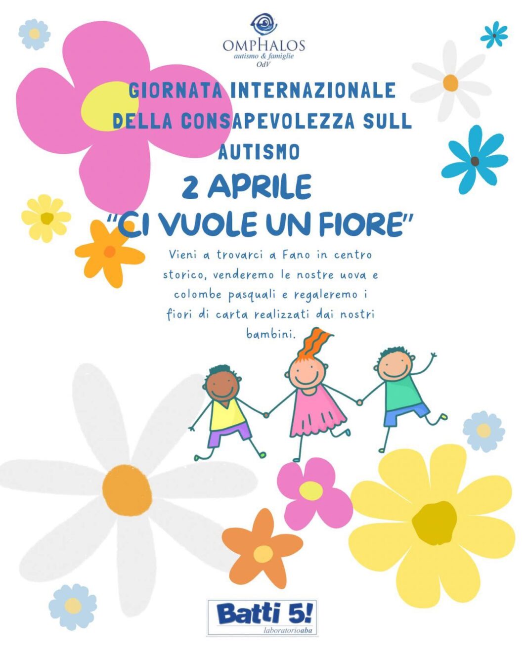 FANO – In occasione della Giornata Mondiale per la Consapevolezza dell’Autismo che ricorre giovedì 2 Aprile, Omphalos OdV porterà la sua Equipe educativa con alcuni suoi bambini in Corso Matteotti a Fano, presso Palazzo Gabuccini, dalle 9 alle 13. I bambini regaleranno fiori di carta, realizzati nel Centro Batti5 di Viale Vittorio Veneto. Inoltre, sarà attivo un info-point e verranno raccolti fondi con la vendita di dolci pasquali.