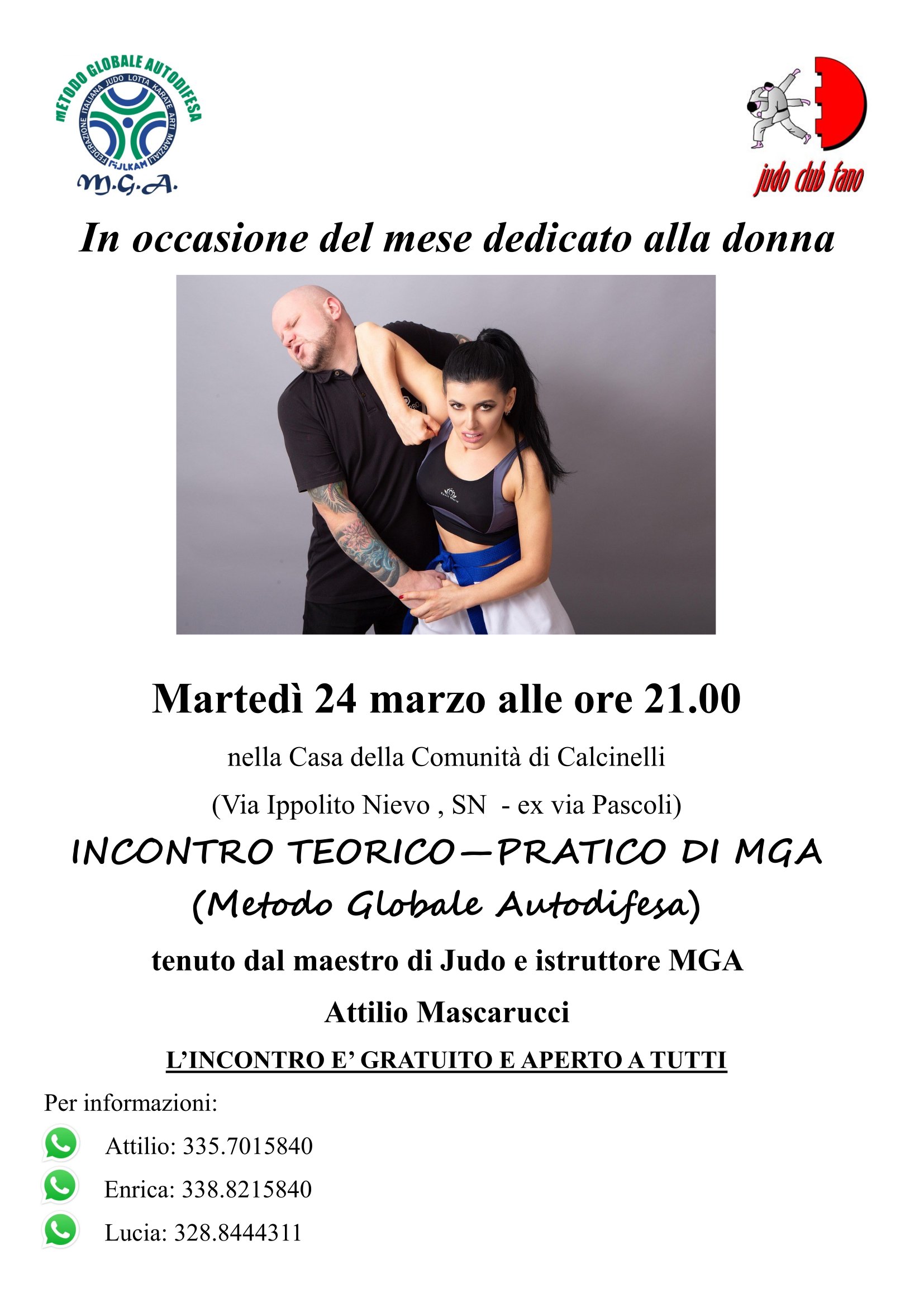 COLLI AL METAURO – In occasione del mese dedicato alla donna, il gruppo MGA (Metodo Globale Autodifesa) organizza, martedì 4 marzo, alle ore 21.00 nella casa della comunità a Calcinelli di Colli al Metauro (via Ippolito Nievo SN, ex via Pascoli), un appuntamento teorico – pratico sulla messa in sicurezza in caso di pericolo. L’incontro, organizzato in collaborazione con il Judo Club Fano e tenuto dal maestro di judo e istruttore MGA Attilio Mascarucci, è gratuito e aperto a tutti, in particolare alle donne e a tutti coloro che vogliono conoscere più da vicino alcune tecniche base per difendersi da eventuali e possibili aggressioni. Oggi come oggi, è diventato fondamentale acquisire nozioni teorico – pratiche per prevenire episodi di violenza contro le donne e non solo.