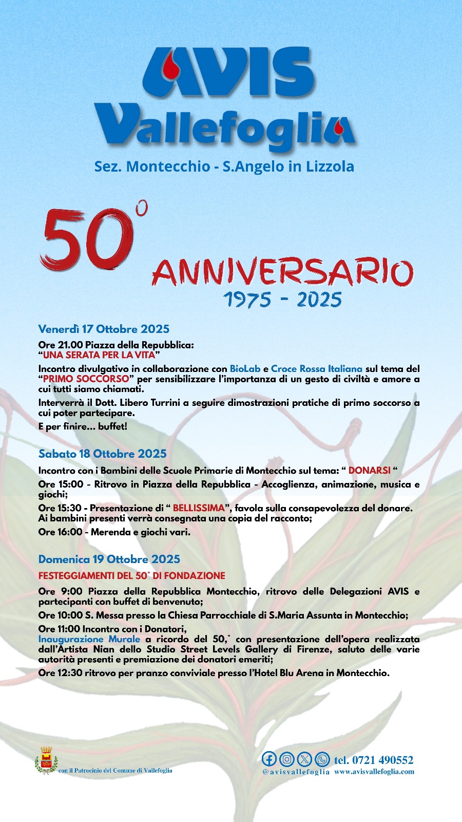 Mezzo secolo di solidarietà, donazioni e impegno civile. L’Avis di Vallefoglia, sezione Montecchio e Sant’Angelo in Lizzola, celebra il 50° anniversario dalla fondazione con un ricco programma di eventi in programma dal 17 al 19 ottobre. Era il 1975 quando 31 cittadini decisero di dare vita alla sezione, mossi dalla volontà di diffondere la cultura della donazione di sangue. Oggi l’Avis di Vallefoglia conta 1.400 iscritti e circa 400 donatori attivi, capaci di garantire ogni anno oltre 500 donazioni di sangue, plasma e piastrine. Numeri che raccontano un presidio sociale fondamentale per la comunità locale e per l’intera provincia di Pesaro e Urbino. «Cinquant’anni di donazioni che hanno salvato tante vite umane – ha sottolineato il sindaco Palmiro Ucchielli –. È l’attività di centinaia di volontari che continuano a dare un contributo prezioso alla città. La donazione di un’opera d’arte sul circolo Arci di Montecchio, realizzata da un artista di fama nazionale, rappresenta un segnale forte per tutta la vallata e un gesto che unisce cultura e solidarietà».