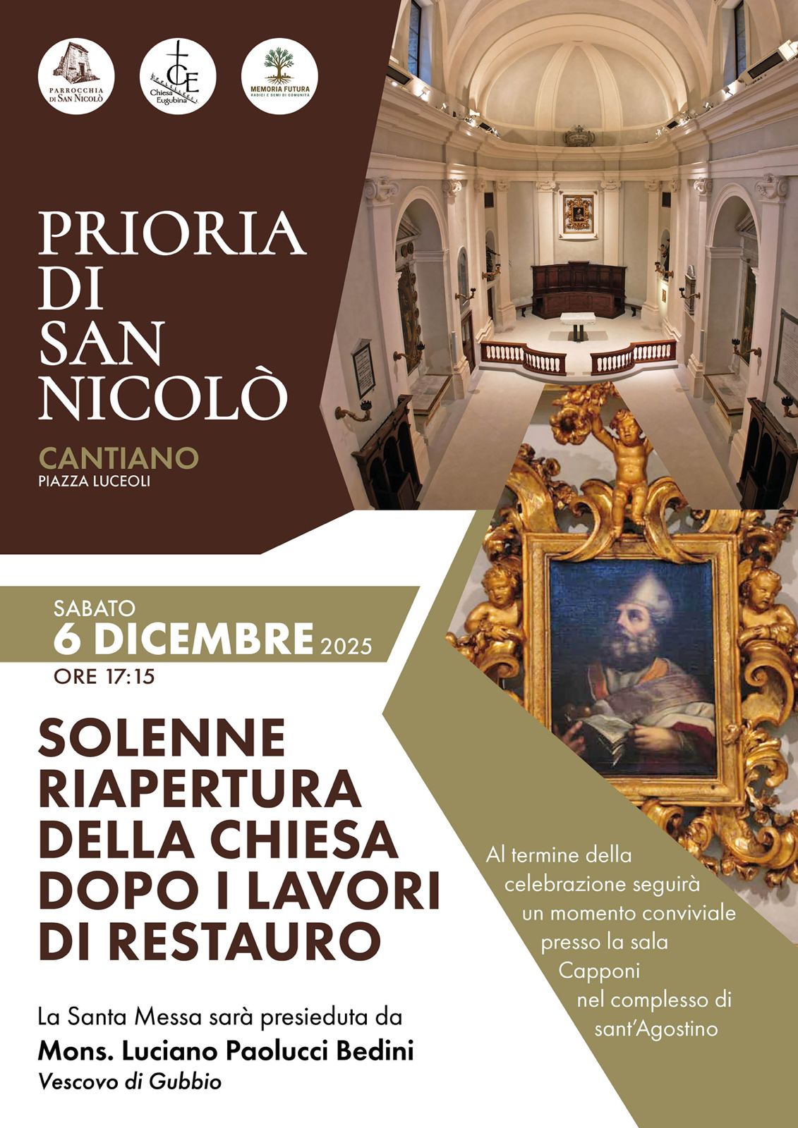 La celebrazione inaugurale, curata dalle parrocchie cantianesi insieme alla Chiesa Eugubina, sarà presieduta dal vescovo di Gubbio, mons. Luciano Paolucci Bedini. Sarà l’occasione per ringraziare quanti hanno contribuito a un recupero complesso e prezioso: dalla messa in sicurezza dell’edificio alla ridefinizione dell’area presbiteriale secondo le indicazioni del Concilio Vaticano II.