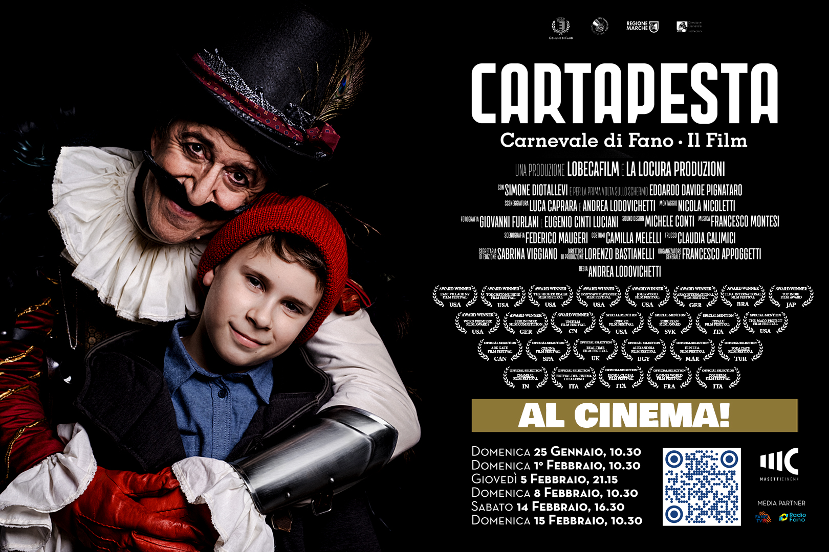 Gli appuntamenti già confermati presso Istituti ed organi culturali che includono quindi anche la promozione della città attraverso l’audiovisivo, si terranno a Sydney, Colonia, Belgrado e Monaco, mentre sono in fase di programmazione ulteriori tappe in Indonesia, Canada, Spagna, Francia ed Inghilterra. Una vittoria collettiva visto che da quasi un anno, grazie a “Cartapesta” e a chi ha voluto sostenerlo, il Carnevale di Fano sta beneficiando di una promozione innovativa, concreta e capillare, ottenendo una visibilità internazionale senza precedenti per l’evento e per il territorio. Queste le date delle prossime proiezioni cittadine: domenica 1 febbraio: ore 10.30; giovedì 5 febbraio: ore 21.15; domenica 8 gennaio: ore 10.30; sabato 14 febbraio: ore 16.30; domenica 15 febbraio: ore 10.30. I biglietti sono acquistabili anche online su www.masetticinema.it – Per prenotazioni scolaresche: scuole@masetticinema.it