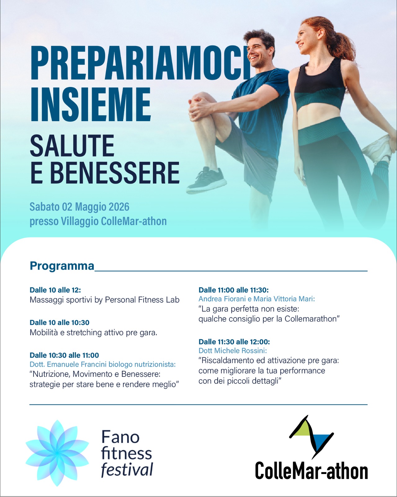 FANO – È tutto pronto per la ColleMar-athon 2026 in programma domenica 3 maggio, che quest’anno sta registrando numeri record di iscritti. Già da sabato spazio alla preparazione al Villaggio, allestito ai Giardini Roma al Pincio di Fano. Dalle 10 alle 12 in programma massaggi sportivi, mentre la mattinata si apre con attività di mobilità e stretching pre gara. Previsti anche momenti di approfondimento con esperti: nutrizione, benessere e consigli pratici per affrontare al meglio la corsa, fino agli interventi su riscaldamento e attivazione muscolare. Un percorso di avvicinamento alla gara realizzato in collaborazione con il Fano Fitness Festival, per accompagnare gli atleti verso la competizione con maggiore consapevolezza e preparazione.