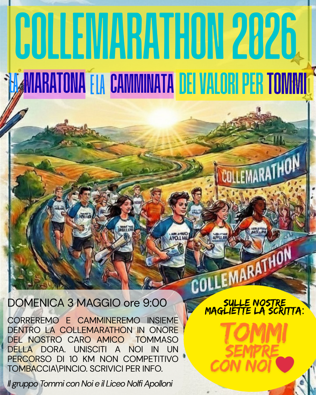 Domenica 3 maggio un gruppo di studenti e docenti del Liceo Nolfi Apolloni correrà la staffetta mentre un altro gruppo farà insieme la camminata non agonistica di 10 chilometri con partenza da Tombaccia alle ore 9:00 e arrivo al Pincio: l’adesione alla camminata è aperta, unitevi a noi, prima della partenza scriveremo sulle nostre magliette la frase “Tommi sempre con noi”.