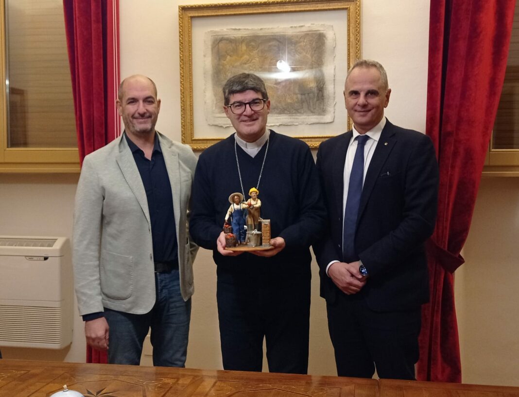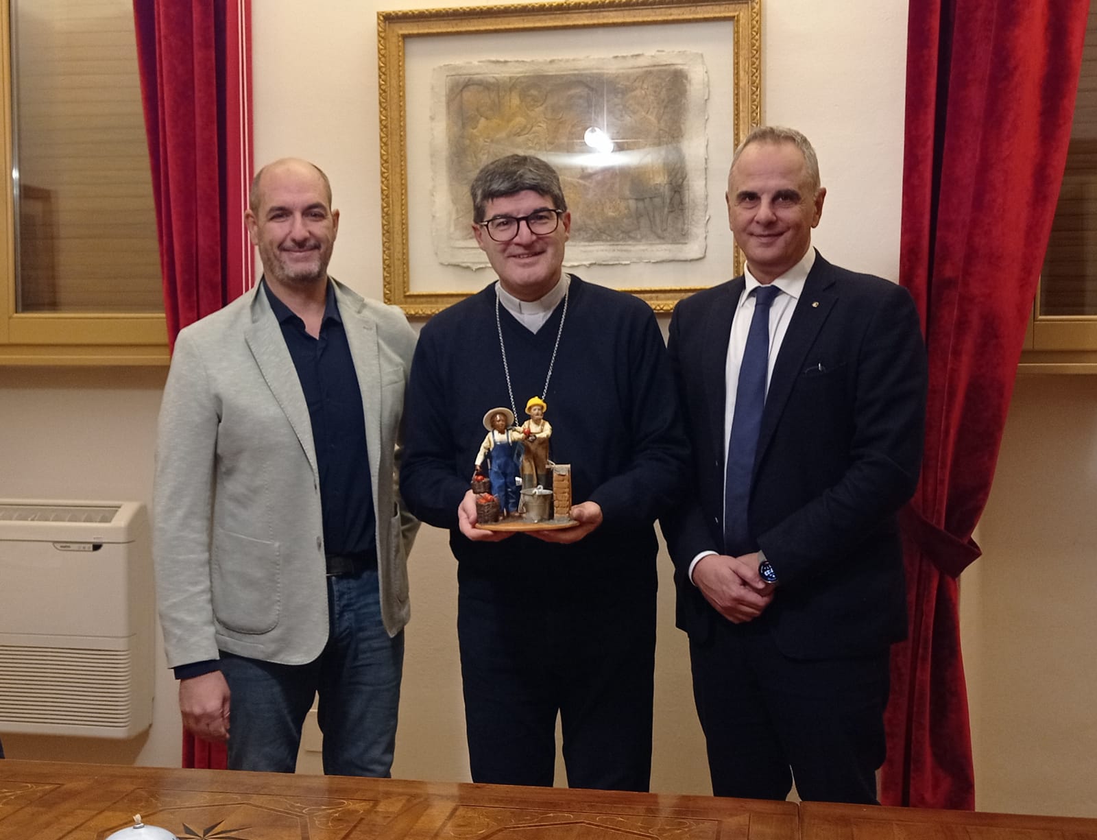 Il segretario di Confartigianato Imprese Ancona – Pesaro e Urbino, Marco Pierpaoli e il presidente di Coldiretti Pesaro Urbino, Tommaso Di Sante, hanno consegnato a Mons. Andrea Andreozzi il manufatto realizzato dal maestro artigiano leccese Claudio Riso, eccellenza nella produzione artistica in cartapesta.