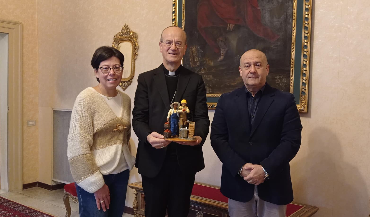 Questa mattina, la referente Confartigianato per la provincia di Pesaro e Urbino, Giada De Simoni e il direttore di Coldiretti Pesaro Urbino Claudio Calevi, hanno consegnato nelle mani di mons. Sandro Salvucci il manufatto realizzato dal maestro artigiano leccese Claudio Riso, eccellenza nella produzione artistica in cartapesta.