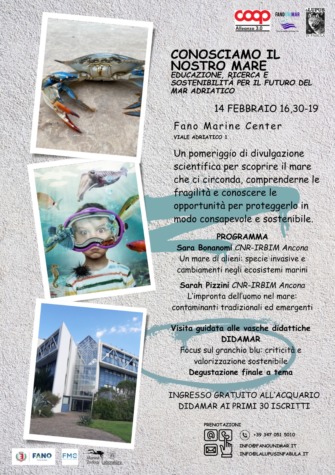 FANO – Un pomeriggio di divulgazione scientifica e partecipazione attiva dedicato al futuro del Mare Adriatico,.organizzato da La Lupus in Fabula e Fano Università del Mare ODV, aperto a cittadini, famiglie, studenti e operatori del territorio, dal titolo “Conosciamo il nostro mare – Educazione, Ricerca e Sostenibilità per il Futuro del Mar Adriatico”, in programma sabato 14 febbraio dalle h 16.00 alle 20.00, presso l’Aula Magna del Fano Marine Center, viale Adriatico 1