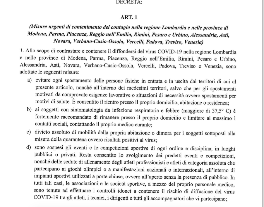 Vincolo di evitare ogni spostamento” nell’intera Lombardia e in quattordici province di Veneto, Emilia Romagna, Piemonte, Marche. Giuseppe Conte firma un decreto del presidente del Consiglio che limita le possibilità di movimento nelle zone più colpite dal contagio Coronavirus. Non è un “divieto assoluto”, spiega, “non si ferma tutto”, non si bloccano treni e aerei: sarà possibile muoversi per comprovate esigenze lavorative o per emergenze e motivi di salute. Ma la polizia potrà fermare i cittadini e chiedere loro perché si stiano spostando in territori dove la crescita dei casi di contagio porta il governo a disporre misure mai così restrittive. “Mi assumo la responsabilità politica” delle decisioni che vengono prese in queste ore: “Ce la faremo”, dice Conte a notte fonda.