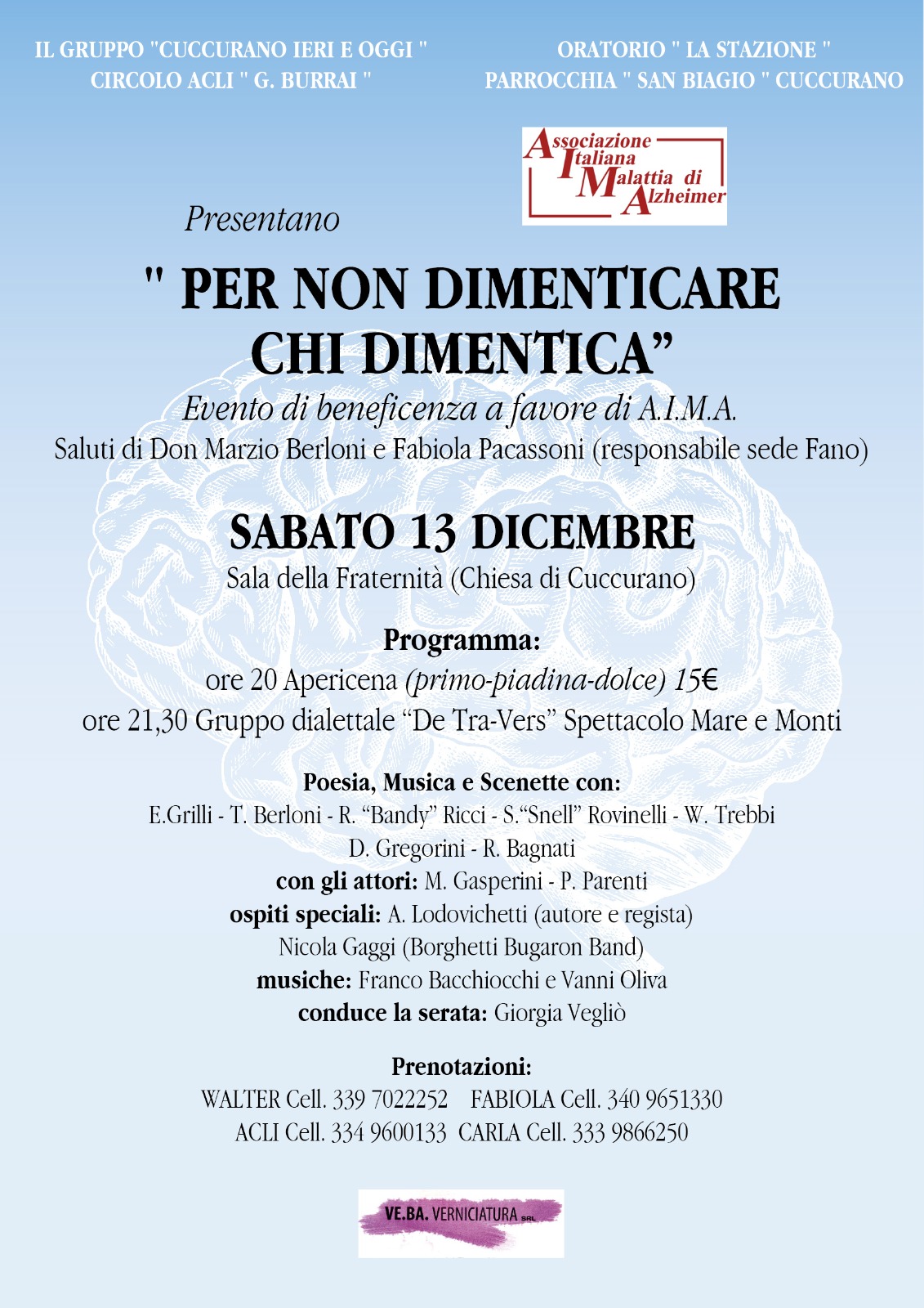 FANO – Una serata dedicata alla memoria, alla solidarietà e al sostegno delle famiglie che convivono con l’Alzheimer. Sabato 13 dicembre, nella Sala della Fraternità della Chiesa di Cuccurano, si terrà l’evento di beneficenza “Per non dimenticare chi dimentica”, promosso dal Gruppo “Cuccurano ieri e oggi”, dal Circolo Acli “G. Burrai”, dall’Oratorio “La Stazione” e dalla Parrocchia San Biagio, in collaborazione con A.I.M.A. – Associazione Italiana Malattia di Alzheimer.