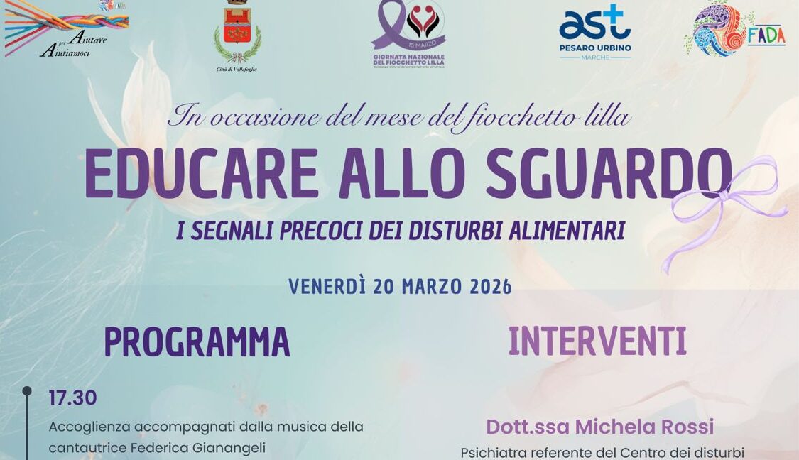 Un appuntamento importante per la comunità, dedicato a un tema delicato e sempre più attuale: i disturbi del comportamento alimentare. L’associazione FADA ODV, insieme al gruppo genitori “Aiutiamoci X Aiutare”, con il supporto del Comune di Vallefoglia e il patrocinio dell’AST Pesaro e Urbino, promuove il convegno dal titolo “Educare allo sguardo”, in programma venerdì 20 marzo alle ore 17:30 presso l’Unione dei Comuni Pian del Bruscolo, a Tavullia.