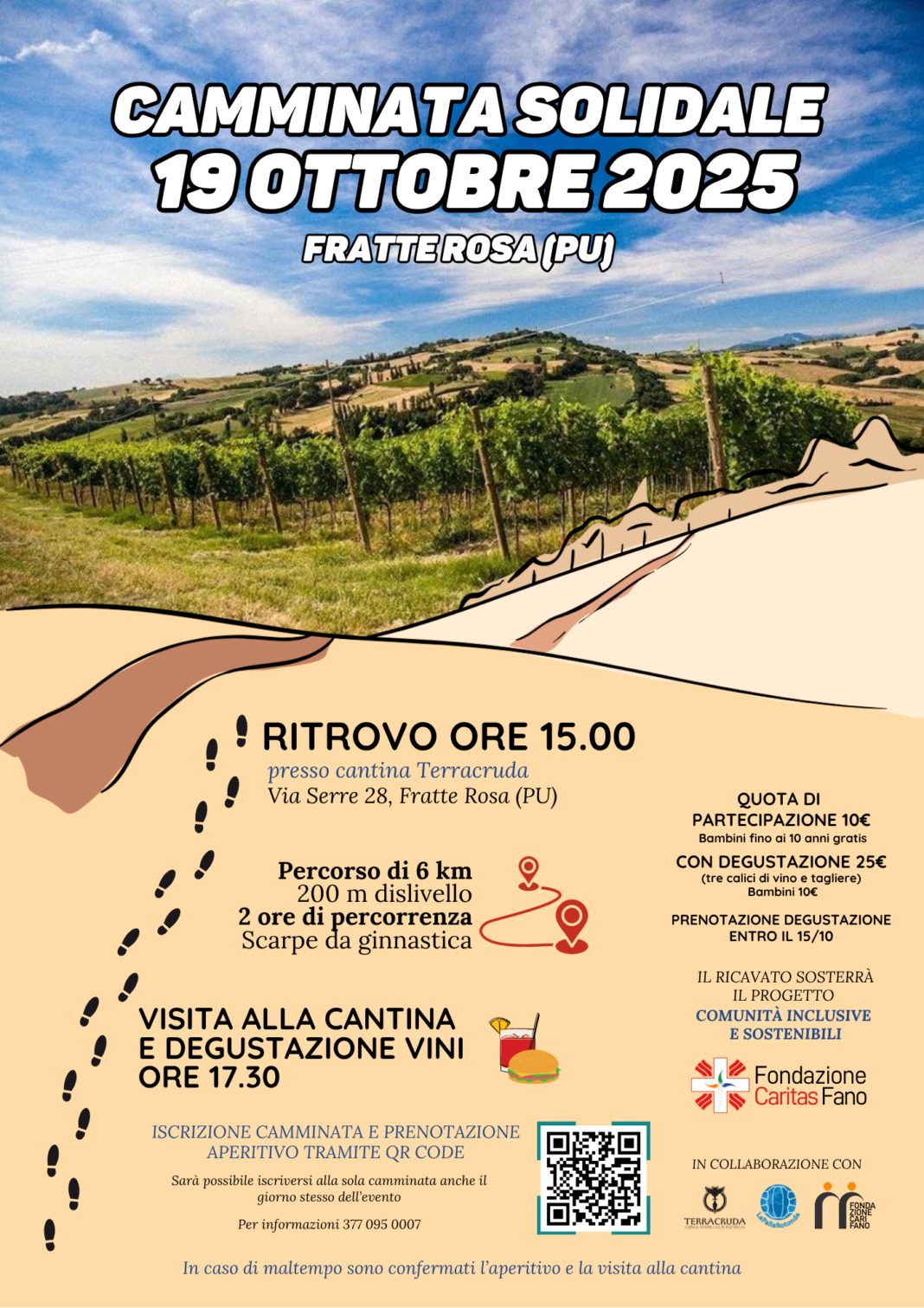 FANO – Domenica 19 ottobre torna con la quarta edizione la Camminata solidale organizzata dalla Caritas diocesana di Fano Fossombrone Cagli Pergola. La camminata prenderà il via presso la cantina Terracruda (via Serre 28, Fratte Rosa) alle ore 15. La passeggiata, della durata di circa un’ora e mezza, è alla portata di tutti ma non adatta a passeggini e simili; terminerà attorno alle 17.30, ritornando al punto di partenza. Al termine della passeggiata è possibile partecipare alla visita alla cantina e alla degustazione di vini, con un contributo di 25€ (comprensivo della quota di partecipazione alla camminata). Per i bambini fino ai 10 anni il costo è di 10€. E’ possibile partecipare anche alla solo camminata, in questo caso con un contributo di partecipazione di 10€ (per i bambini fino ai 10 anni è gratuito).