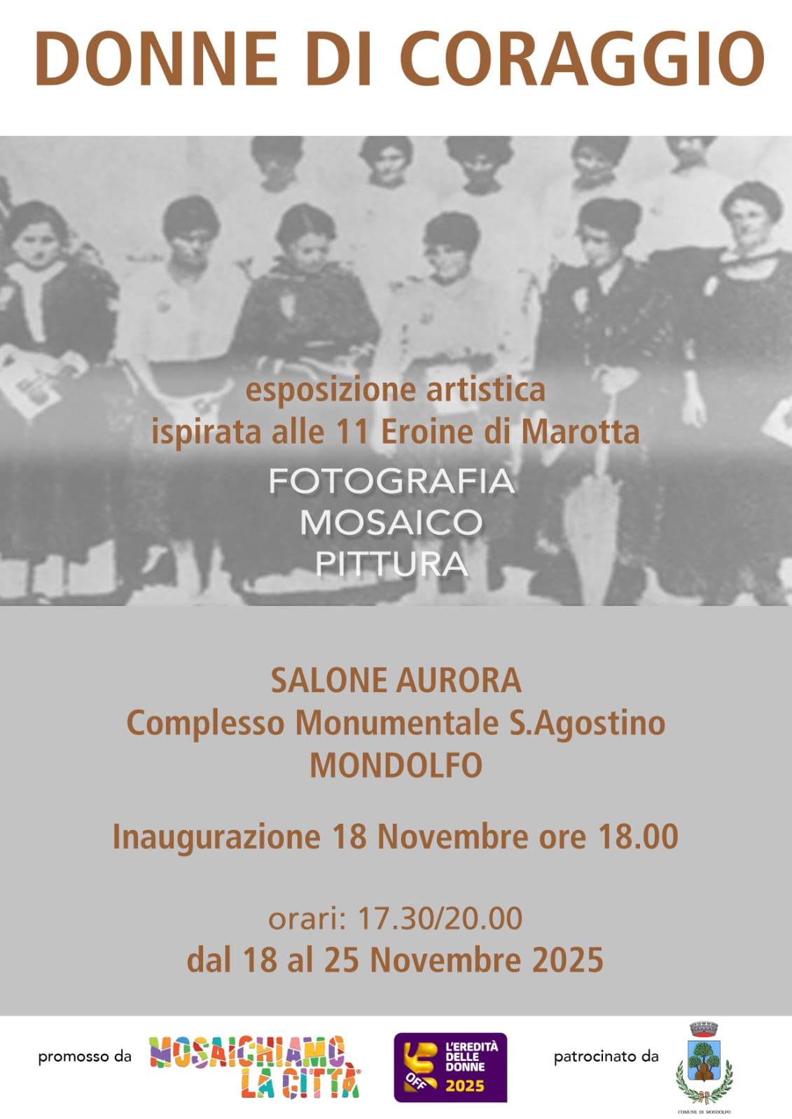 MONDOLFO – L’arte incontra la memoria nel segno del coraggio. Si inaugura martedì 18 novembre al Salone Aurora del Complesso Monumentale di Sant’Agostino la mostra collettiva “Donne di Coraggio”, un omaggio alla straordinaria vicenda delle undici ragazze di Marotta che, durante la Prima guerra mondiale, sfidarono il mare in tempesta per salvare l’equipaggio del pontone Faà di Bruno.