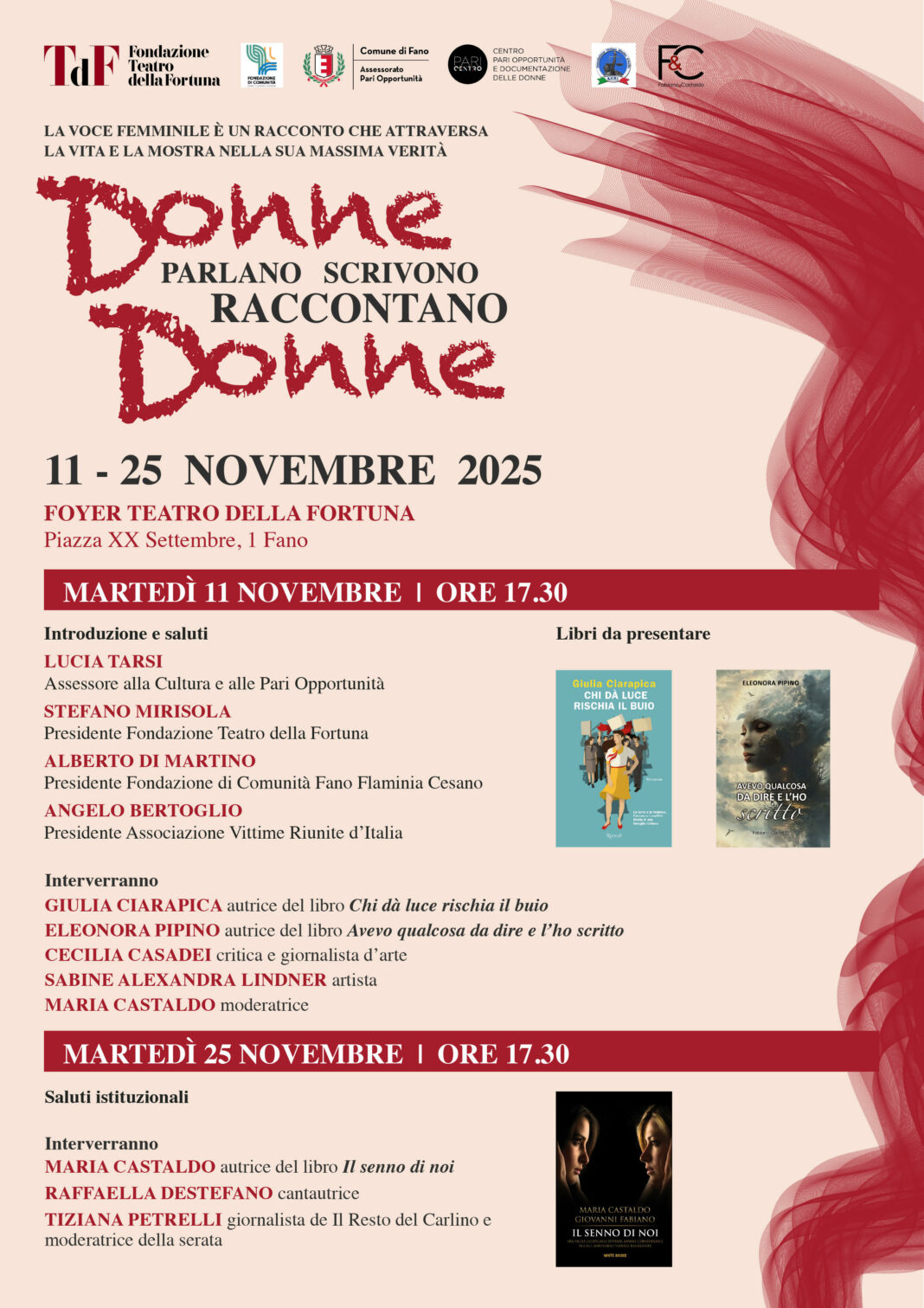 FANO – Prende il via domani, martedì 11 novembre alle ore 17.30, nel foyer del Teatro della Fortuna, la rassegna “Donne parlano scrivono raccontano donne”, un doppio appuntamento dedicato alla parola femminile come strumento di racconto, libertà e consapevolezza.
