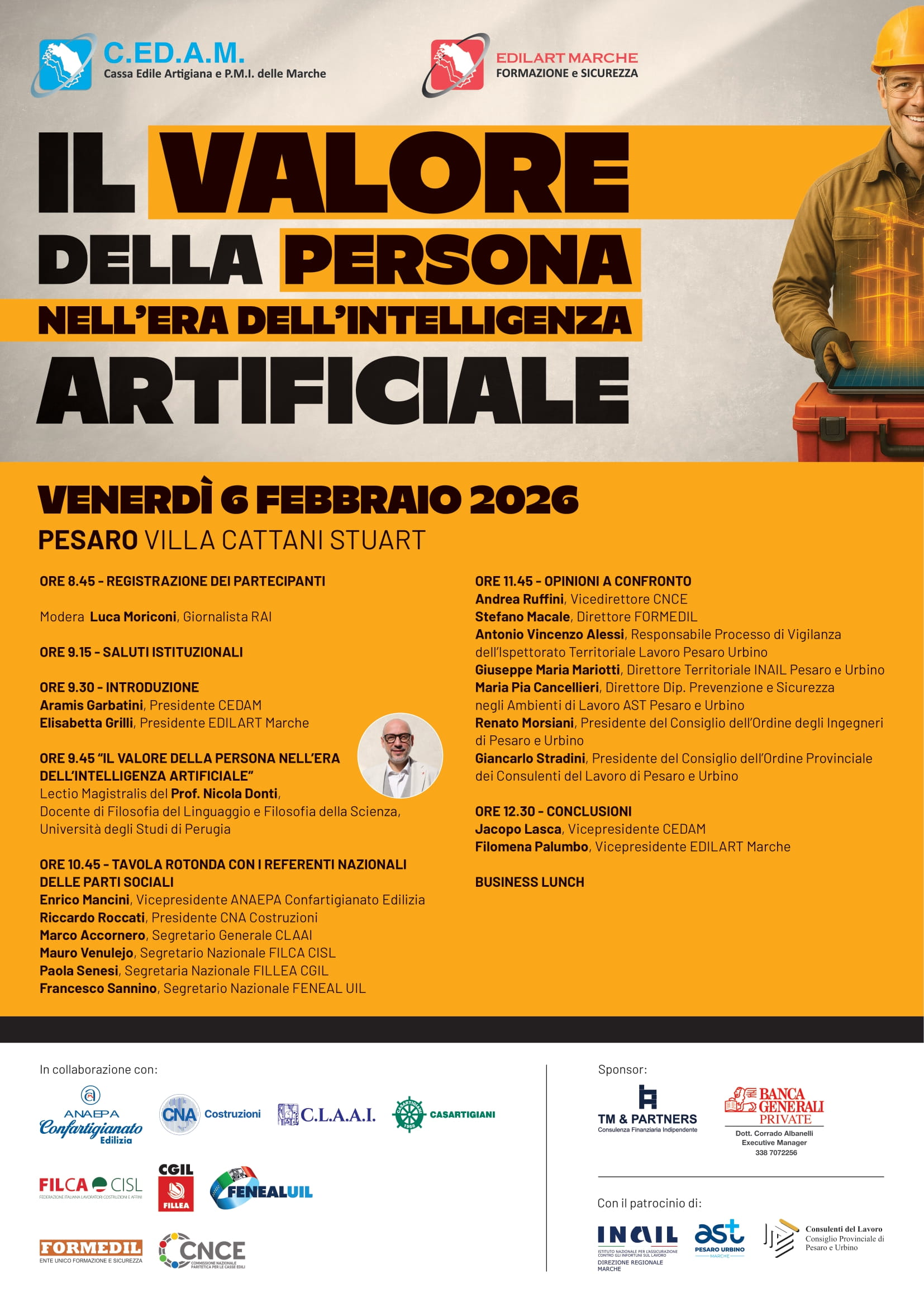 Ecco i principali obiettivi dell’evento dal titolo “Il valore della persona nell’era dell’intelligenza artificiale” organizzato da Cedam Marche ed Edilart Marche per Venerdì 6 Febbraio dalle ore 8.45 a Pesaro presso Villa Cattani Stuart.