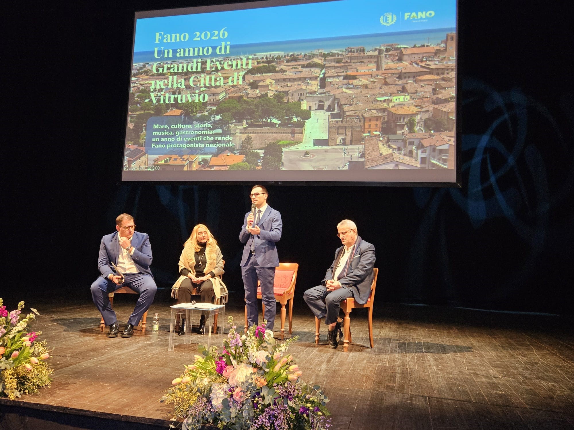 FANO – «Presentiamo il nuovo programma degli eventi della città nel segno di Vitruvio, una scoperta che ha già cambiato e cambierà le prospettive di Fano nel mondo». Così il Sindaco Luca Serfilippi dal palco del Teatro della Fortuna, durante la presentazione di “Fano 2026. Un anno di grandi eventi nel cuore di Vitruvio”, il calendario che raccoglie gli appuntamenti principali che animeranno la città nel corso dell’anno.