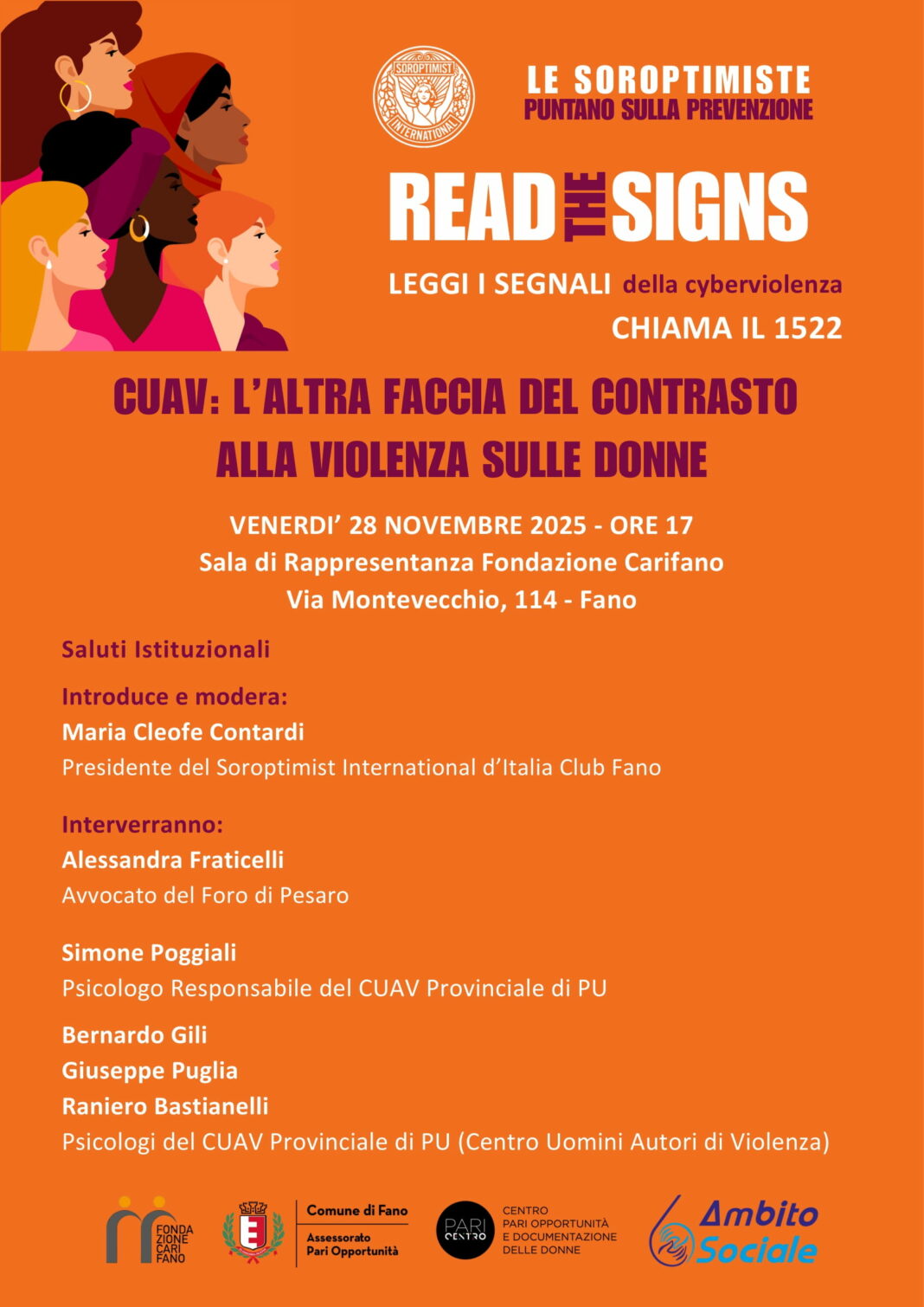 Quest’anno è stato organizzato un convegno aperto al pubblico dal titolo “CUAV: L’altra faccia del contrasto alla violenza sulle donne”, in programma venerdì 28 novembre alle ore 17.00 nella Sala di Rappresentanza della Fondazione Carifano. L’incontro sarà dedicato agli uomini autori di violenza domestica e di genere.