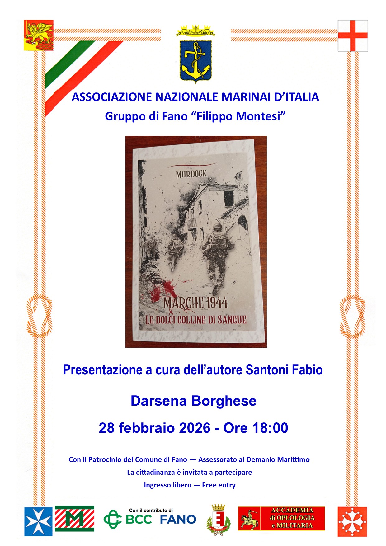 FANO – Il Gruppo di Fano dell’Associazione Nazionale Marinai d’Italia invita la cittadinanza alla presentazione del libro di Fabio Santoni “Marche 1944. Le dolci colline di sangue”, in programma sabato 28 febbraio alle ore 18 nella sede ANMI della Darsena Borghese, in via Nazario Sauro.