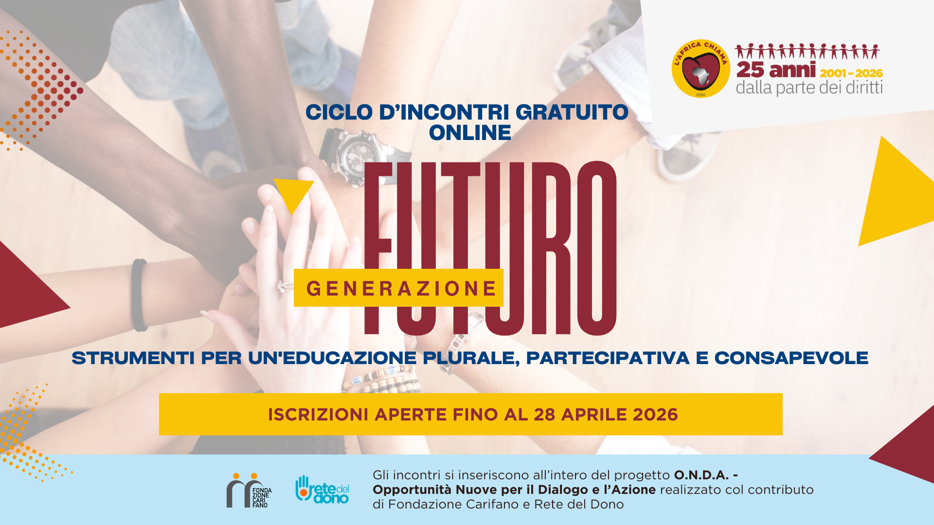 FANO – Sono aperte fino al 28 aprile le iscrizioni a “Generazione Futuro: strumenti per un’educazione plurale, partecipativa e consapevole”, il nuovo percorso formativo promosso da L’Africa Chiama.