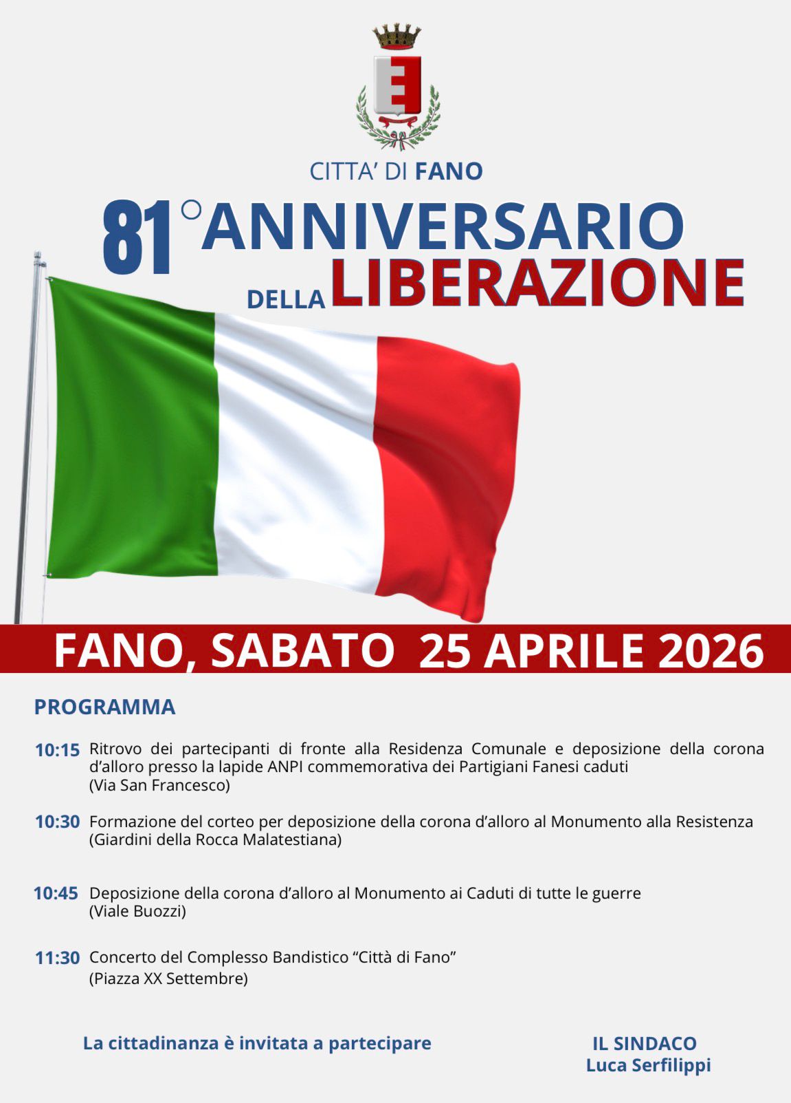 FANO – La città di Fano celebra l’81° anniversario della Liberazione con una mattinata di iniziative istituzionali dedicate al ricordo dei caduti e ai valori della democrazia. Il programma di sabato 25 aprile prenderà il via alle 10:15 con il ritrovo davanti alla Residenza comunale e la deposizione della corona d’alloro presso la lapide ANPI in via San Francesco. Seguirà la formazione del corteo verso il Monumento alla Resistenza ai Giardini della Rocca Malatestiana, per poi proseguire con la deposizione della corona al Monumento ai Caduti in viale Buozzi. La mattinata si concluderà alle 11:30 in piazza XX Settembre con il concerto del Complesso Bandistico “Città di Fano”.