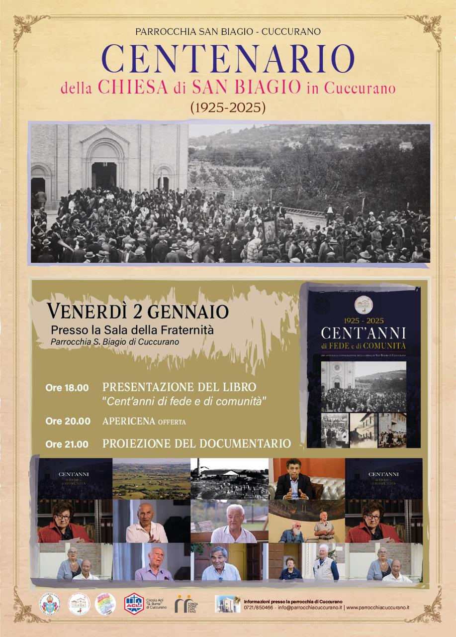 Cento anni di storie, di fede e di volti raccontati in un libro e in un documentario perché le nuove generazioni e non solo conoscano le proprie radici e si sentano sempre più parte della comunità. Venerdì 2 gennaio, alle ore 18.00 nella sala della fraternità della parrocchia di Cuccurano, in occasione del centenario di consacrazione della chiesa di San Biagio, saranno presentati il libro e il documentario video dal titolo “Cent’anno di fede e di comunità”. Il libro e il video ripercorrono, attraverso testimonianze e ricerche storiche in varie archivi, una “strada” lunga cento anni dove i ricordi si fanno sempre più vivi nella mente di chi ha vissuto ed è stato protagonista, a suo modo, di un pezzo di storia della propria comunità parrocchiale. “Tutto questo – spiega Francesco Pedini ideatore dell’iniziativa insieme al parroco don Marzio Berloni – è nato dalla presenza di diversi documenti contenuti negli archivi lasciati dai parroci precedenti. Una volta allargate le ricerche sia nell’archivio di stato che in quello diocesano, ne sono emersi tanti altri di grande interesse. Da qui abbiamo abbandonato ogni indugio e ci siamo lanciati, con passione ed entusiasmo, in questo progetto poiché ci è sembrato quasi un dovere morale rendere note alla comunità di Cuccurano le notizie che fanno parte della loro storia, delle loro origini”. Alla presentazione del libro e del documentario interverranno il giornalista Massimo Foghetti, moderatore della serata, Francesco Pedini, Giuseppina Boiani Tombari, archivista e curatrice di alcuni capitoli del libro insieme al filologo Luca Camillucci.