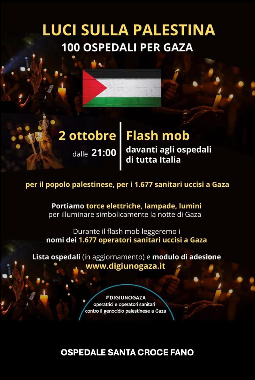 FANO – Oltre 180 ospedali in tutta Italia si illumineranno e decine di migliaia di operatrici e operatori sanitari ricorderanno i nomi dei 1.677 colleghi e colleghe uccis* a Gaza in una lettura a staffetta nazionale.