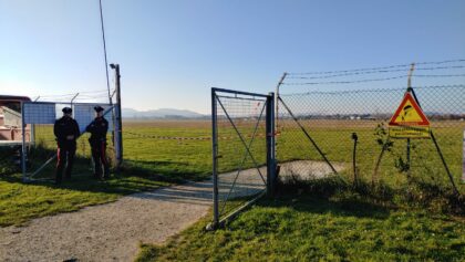 I carabinieri presidiano l’area dove è avvenuto il tragico incidente costato la vita a due paracadutisti \ Foto di Stefano Bargnesi