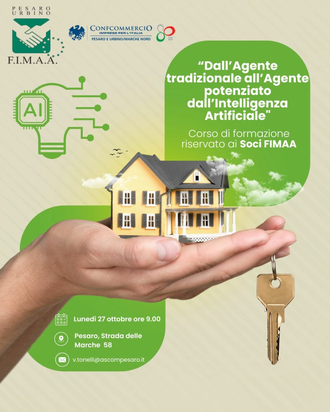 PESARO – Fimaa – Federazione Italiana Mediatori Agenti Affari aderente a Confcommercio, organizza il corso di formazione “Dall’Agente tradizionale all’Agente potenziato dall’Intelligenza Artificiale”. E’ in programma lunedì 27 ottobre dalle 9 alle 12.30 presso la sede di Confcommercio Marche Nord con coffee break. Si tratta di un corso di formazione specialistico interamente dedicato all’implementazione dell’Intelligenza Artificiale (IA) nel lavoro quotidiano dell’Agente Immobiliare. Il docente è Luca Paolini, Consulente Strategico. Il corso si propone di illustrare come l’IA non sostituirà la professione, ma la renderà più competitiva ed efficiente per chi saprà integrarla. L’obiettivo primario è far comprendere come l’IA sia una leva strategica per il riposizionamento competitivo sul mercato e per rafforzare il valore percepito della professione. Cinque i moduli. Ogni modulo sarà corredato da esempi pratici e indicazioni sugli strumenti da utilizzare per raggiungere i risultati definiti. A fine corso, tutti i partecipanti riceveranno materiale di supporto per consolidare l’apprendimento. E’ possibile iscriversi (ultimi posti disponibili) fino a venerdì 24, scrivendo alla mail v.tonelli@ascompesaro.it. Il corso è gratuito per gli iscritti FIMAA.