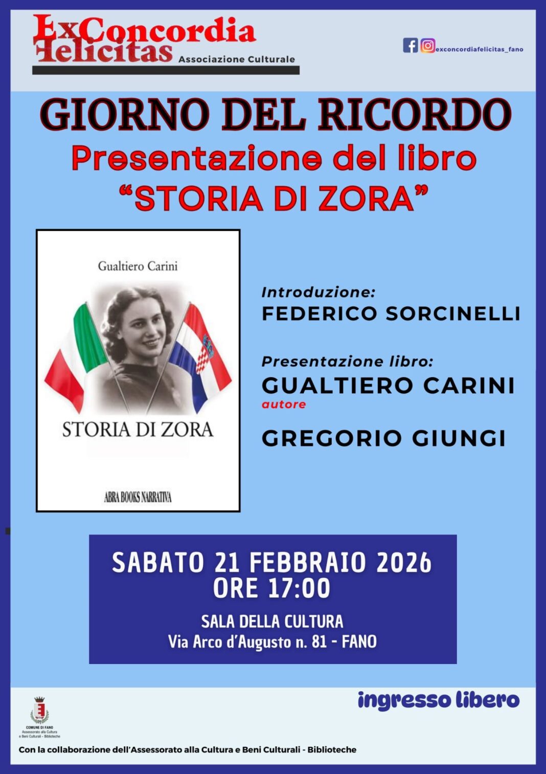 “Ci sembra giusto quindi per Il Giorno del Ricordo di quest’anno presentare il libro Storia di Zora, che racconta le vicende di una famiglia croata, politicamente moderata, della quale due figlie sposarono due ufficiali italiani e che dovettero fuggire poi in Italia per sopravvivere, (un loro fratello venne infoibato); l’autore, il Dott. Gualtiero Carini, commercialista di Ancona è il nipote di questa Zora e racconta la storia della sua famiglia, partendo dal diario scritto dalla nonna”.