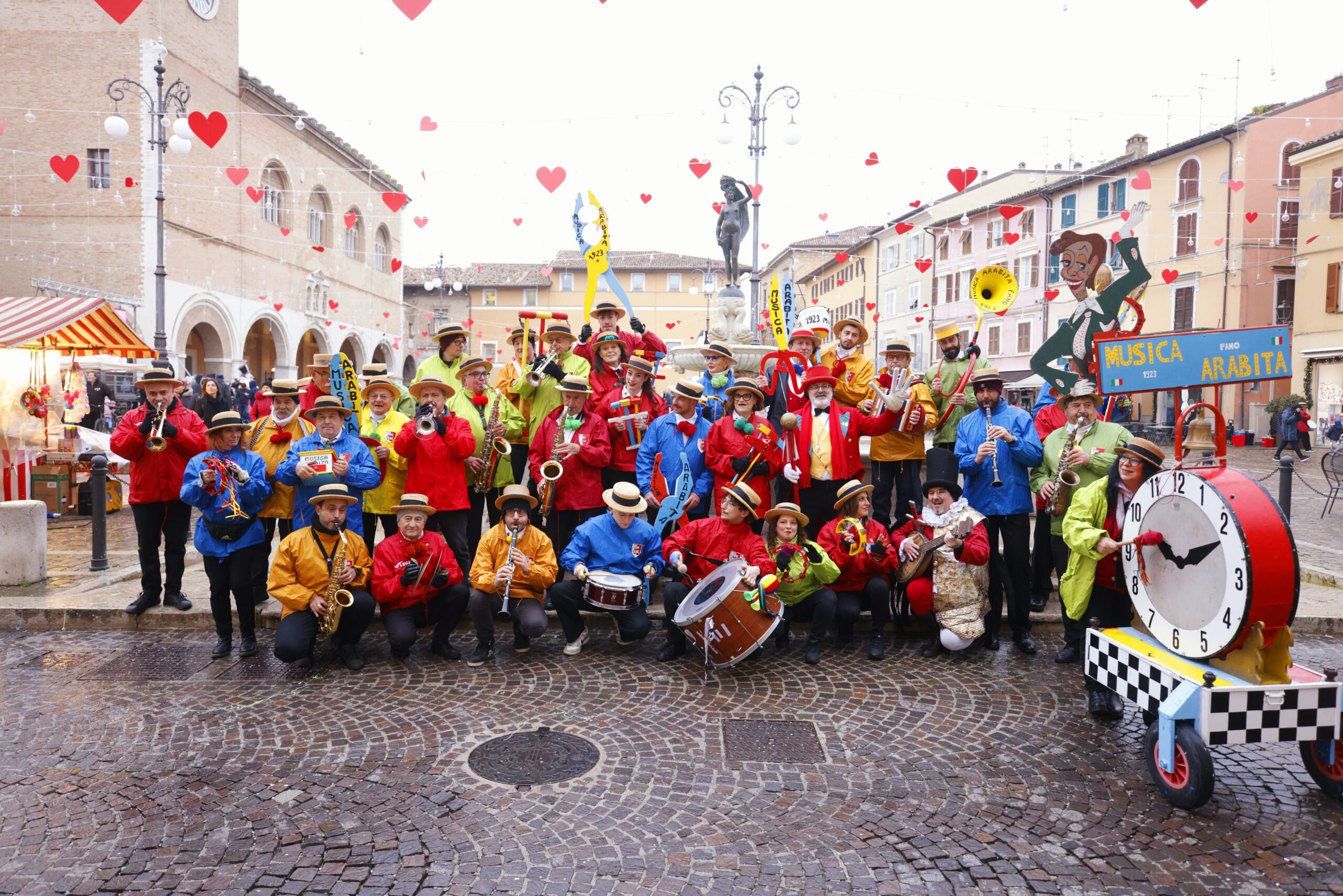 La giornata si è aperta con l’iconico Alzabandiera di Fano – Città del Carnevale, accompagnato dalle note della Musica Arabita, che ha saputo trasformare anche l’atmosfera più istituzionale in puro spirito di festa.