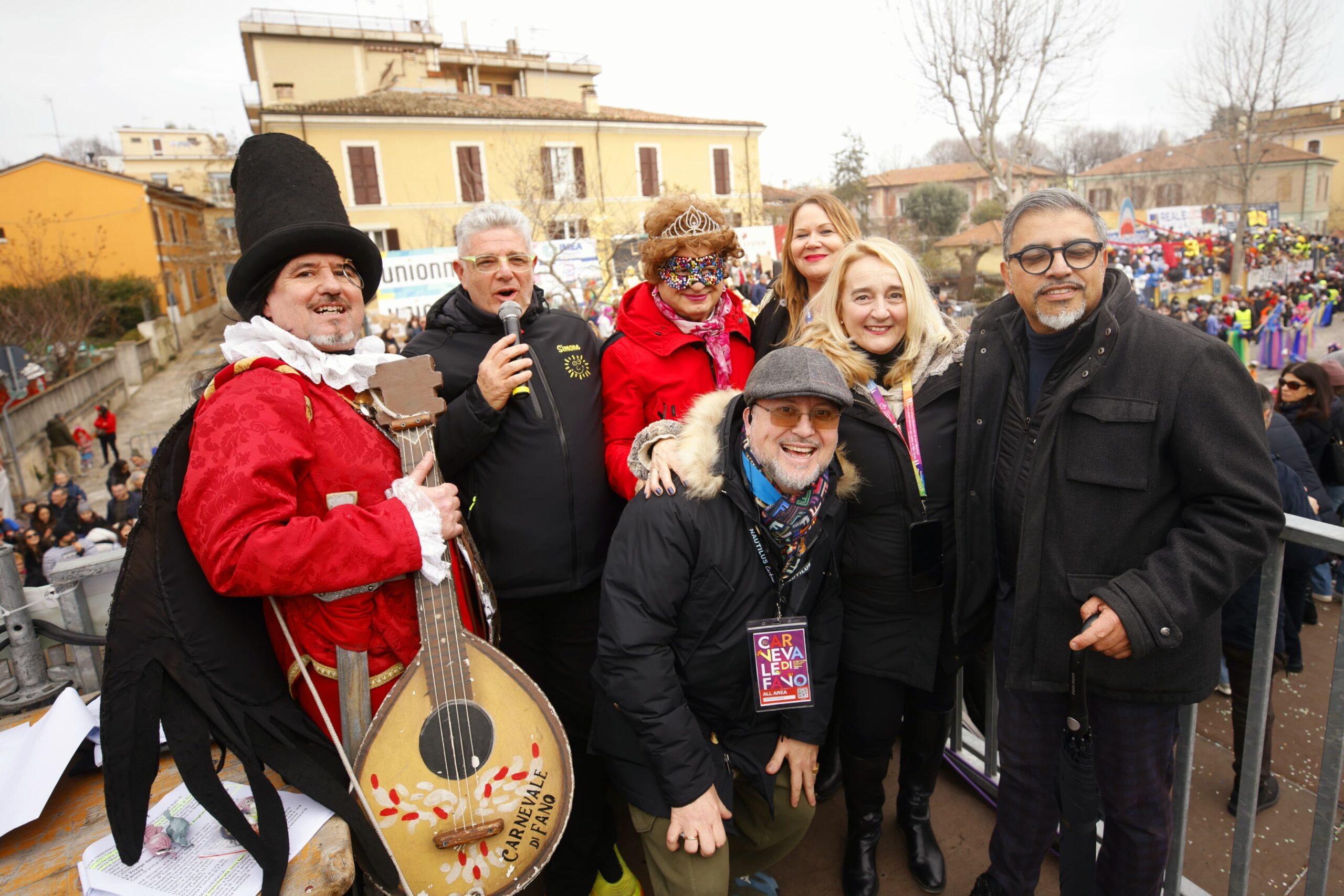 A sorprendere pubblico e organizzazione è stato inoltre l’arrivo di Francesca Fellini, ultima erede per DNA del Maestro Federico Fellini, che ha voluto vedere da vicino il carro realizzato da Luca Vassilich, dedicato allo zio e al suo immaginario onirico. Francesca Fellini, insieme al compagno Graziano Villa, fotografo di fama internazionale, è arrivata a Fano già dalla mattina e ha visitato anche gli scavi archeologici dove sono stati rinvenuti i resti della Basilica di Vitruvio, unendo idealmente la grande festa cittadina al patrimonio storico e culturale della città.
