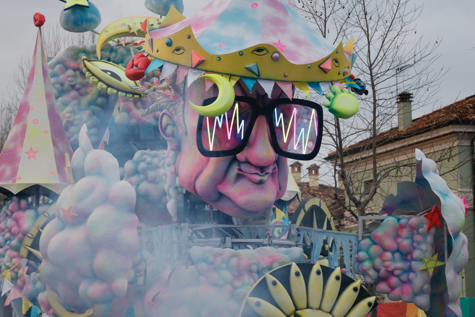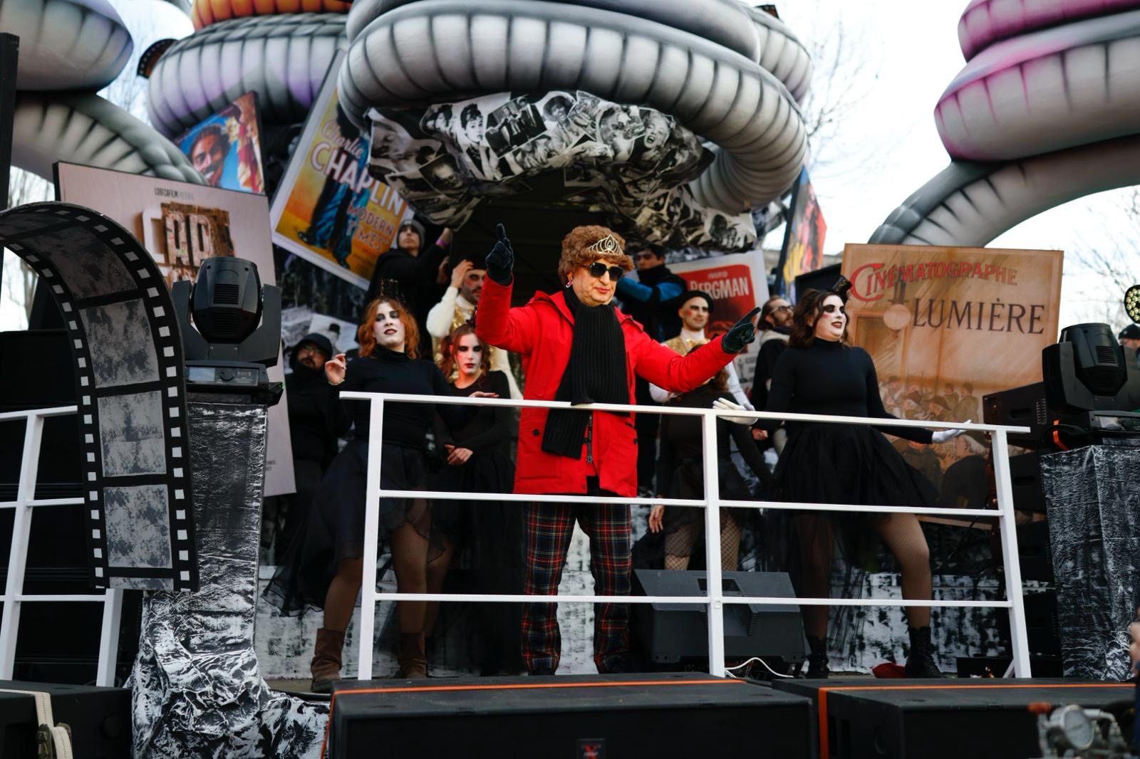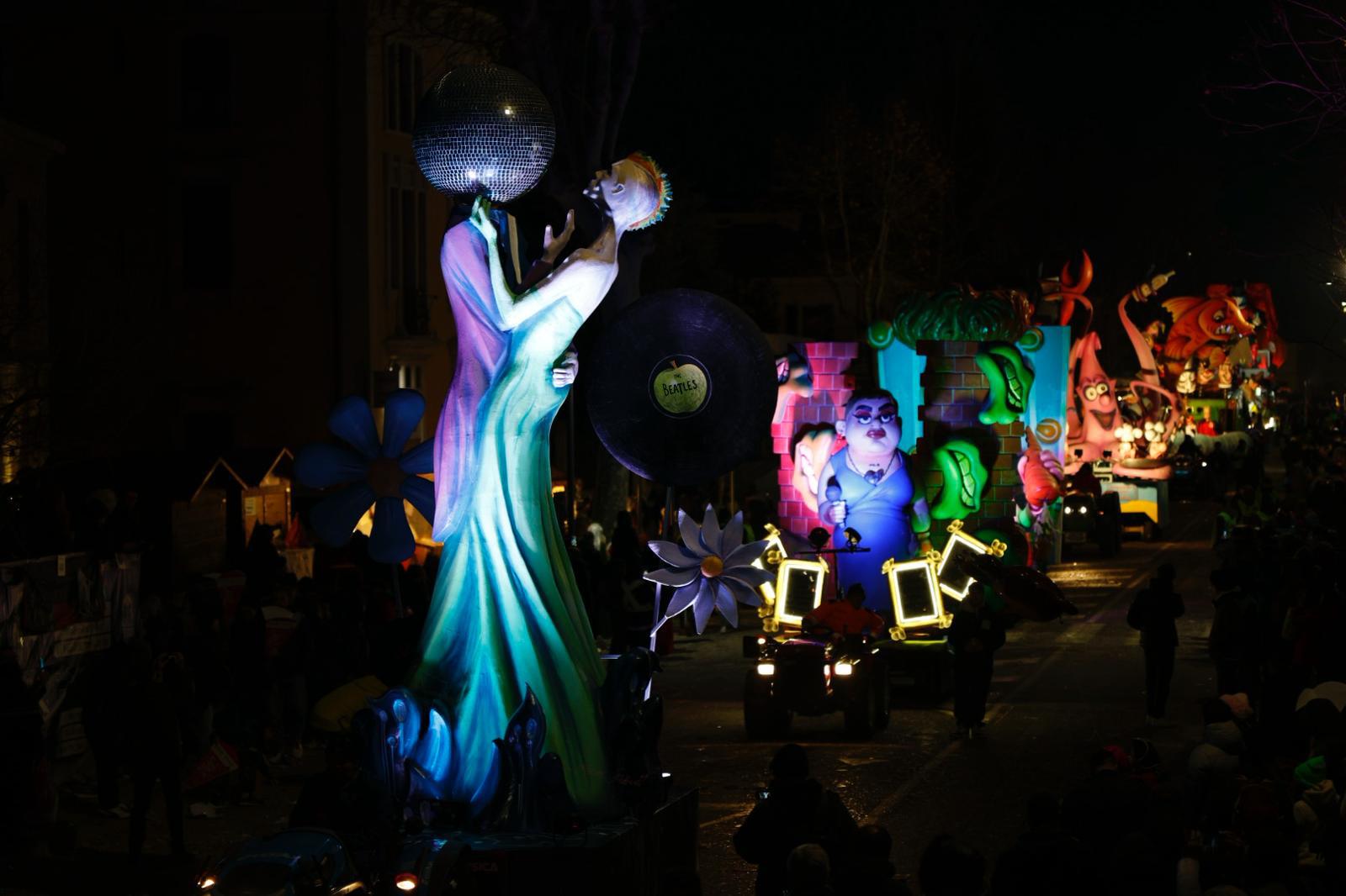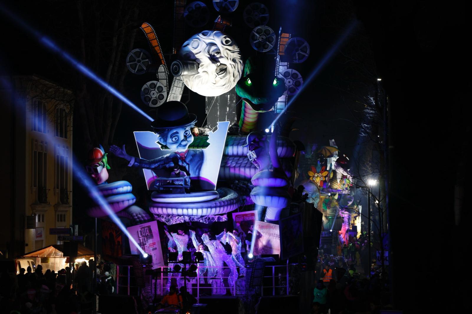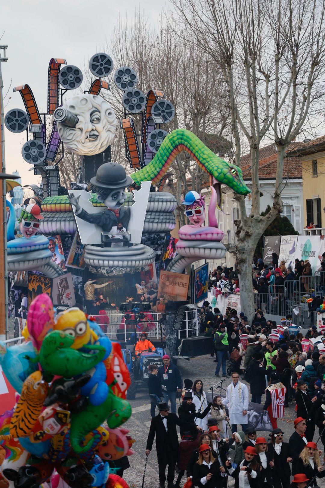 Lungo il percorso hanno sfilato tutti i carri allegorici dell’edizione, vere e proprie scene in movimento. Dal viaggio nella storia del grande schermo raccontato da Le Voyage dans le Cinema di Matteo Angherà per l’associazione Carnival Factory, alle atmosfere visionarie de La testa tra le nuvole di Luca Vassilich, passando per Chi vuol esser lieto sia… firmato da Daniele Mancini Palamoni, fino all’omaggio cinematografico e identitario di Carnevale di Fano CineOscar realizzato da Giox & Mauro Chiappa per Fantagruel.
