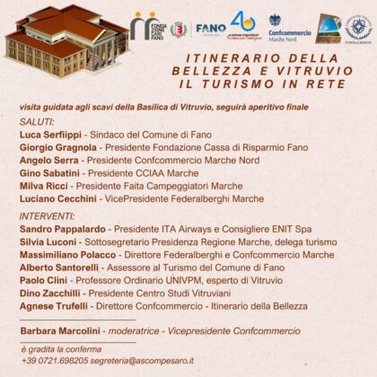 Si entrerà poi nel vivo delle varie tematiche con Sandro Pappalardo, Presidente ITA Airways e Consigliere ENIT; Silvia Luconi, Sottosegretario Presidenza Regione Marche, delega turismo; Massimiliano Polacco, Direttore Federalberghi e Confcommercio Marche; Alberto Santorelli, Assessore al Turismo del Comune di Fano; Paolo Clini, Professore Ordinario UNIVPM, esperto di Vitruvio; Dino Zacchilli, Presidente Centro Studi Vitruviani; Agnese Trufelli, Direttore Confcommercio. Modera Barbara Marcolini, Vicepresidente Confcommercio.