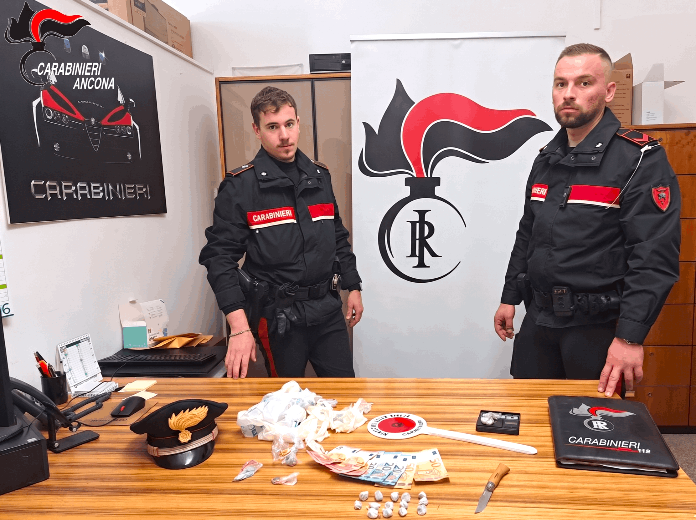 Durante l’inseguimento, il ventenne ha cercato di disfarsi di un involucro: all’interno i militari hanno trovato due dosi di hashish (circa 5 grammi), un bilancino di precisione e un coltello pieghevole. Per questo è stato anche denunciato per porto di oggetti atti ad offendere.