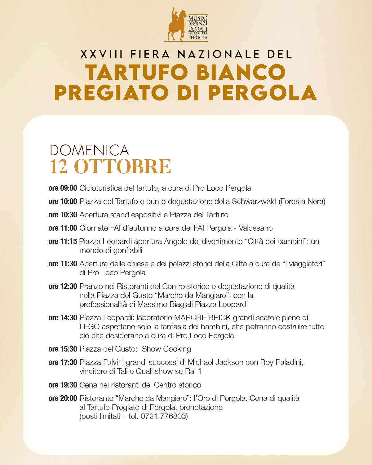 La giornata si concluderà al Ristorante ‘Marche da Mangiare’ con la Cena di qualità al tartufo bianco pregiato di Pergola, a cura dello chef Lucio Pompili, in collaborazione con il ristorante Giardino. Prenotazione: 0721.776803.