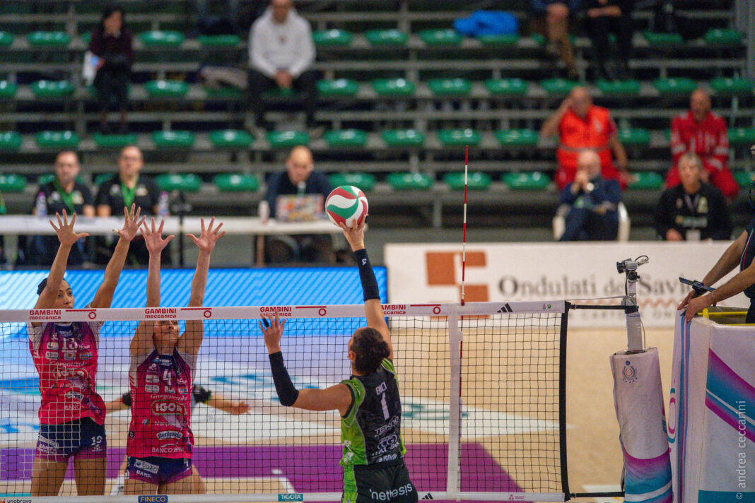 La Megabox Ondulati del Savio Vallefoglia cede ad una Igor travolgente nel primo set e poi capace nel terzo e nel quarto set di spuntarla nei finali punto a punto grazie alla potenza di Tolok (Mvp con 30 punti e il 51% di efficienza su 43 palloni attaccati) e alla tecnica e all’esperienza di Ishikawa (18 punti e il 43%) e Herbots (12 punti con il 47%). Nelle file delle tigri, combattive e tenaci dal secondo set in poi dopo un primo set praticamente non giocato, top scorer Bici (15 punti), poi Omoruyi e la preziosissima Ungureanu (12 punti entrambe, ma la romena, uscendo dalla panchina, è stata molto efficace chiudendo con il 47% di efficienza). Tre punti d’oro per la Igor, mentre la Megabox, a differenza dell’andata, non raccoglie punti al termine di una partita molto equilibrata. Nel primo set il primo break è della Igor, che vola 9-3 su un turno di servizio di Cambi, ma la Megabox ci mette del suo con tre errori e un muro subito tra Giovannini e Candi. Tolok è inarrestabile, mentre Bartolucci si può appoggiare solo su Bici. Entra Carletti, Bici manda out e le tigri scivolano a -8. Pistola si gioca i due timeout nella prima metà del set, ma in campo non c’è partita: Ishikawa firma il 16-6, entra Lázaro e Omoruyi trova due punti in fila. Squarcini ritrova il +10 a muro, con la Megabox in difficoltà in ricezione sulle battute pungenti delle avversarie. Herbots e Ishikawa allungano 21-9, chiude un muro di Tolok con un 25-11 severissimo.