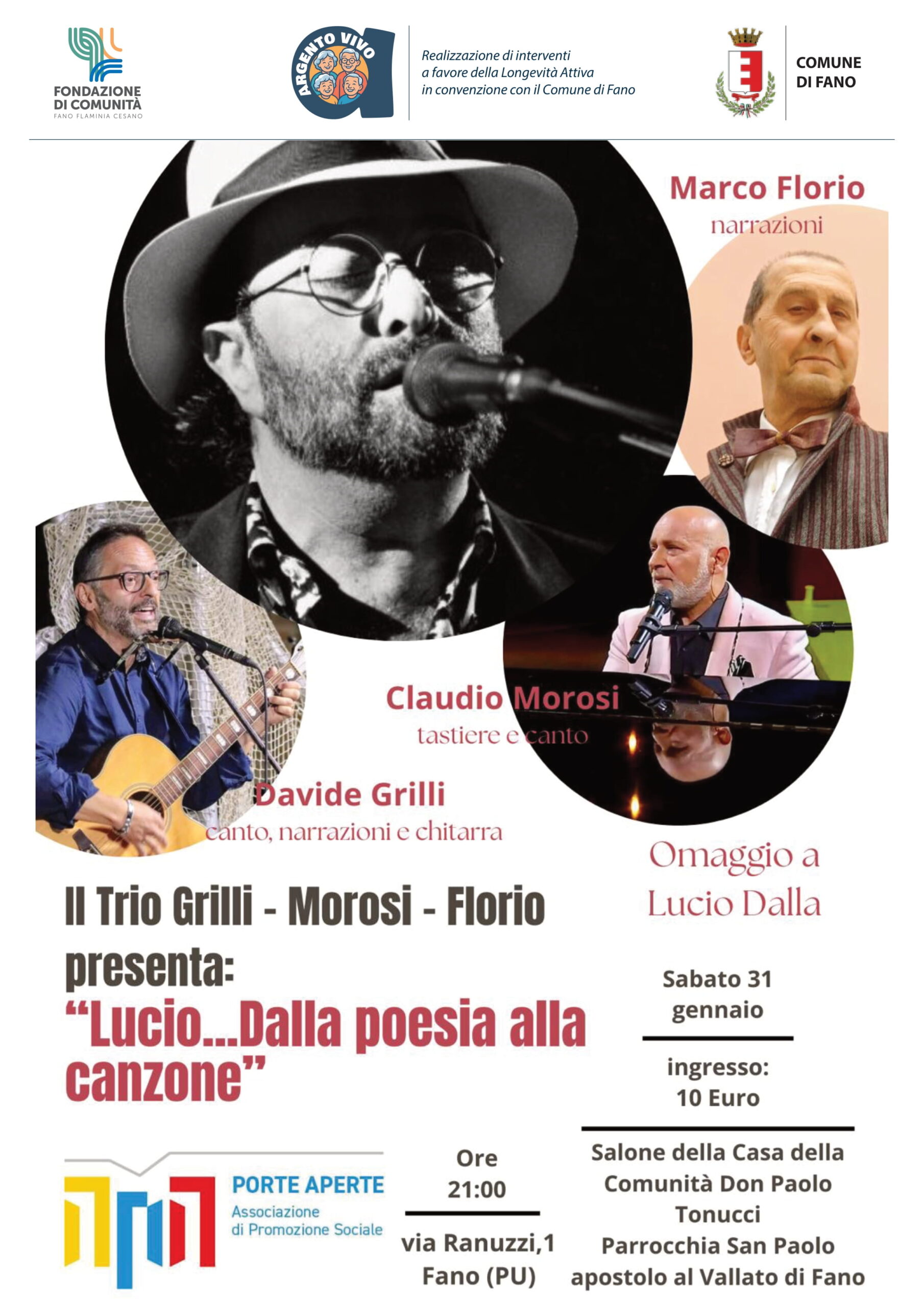 FANO – Sabato 31 gennaio alle ore 21 nel salone della Casa della Comunità don Paolo Tonucci, grande spettacolo musicale sulle più belle canzoni di Lucio Dalla, a cura del trio Davide Grilli, Claudio Morosi e Marco Florio.