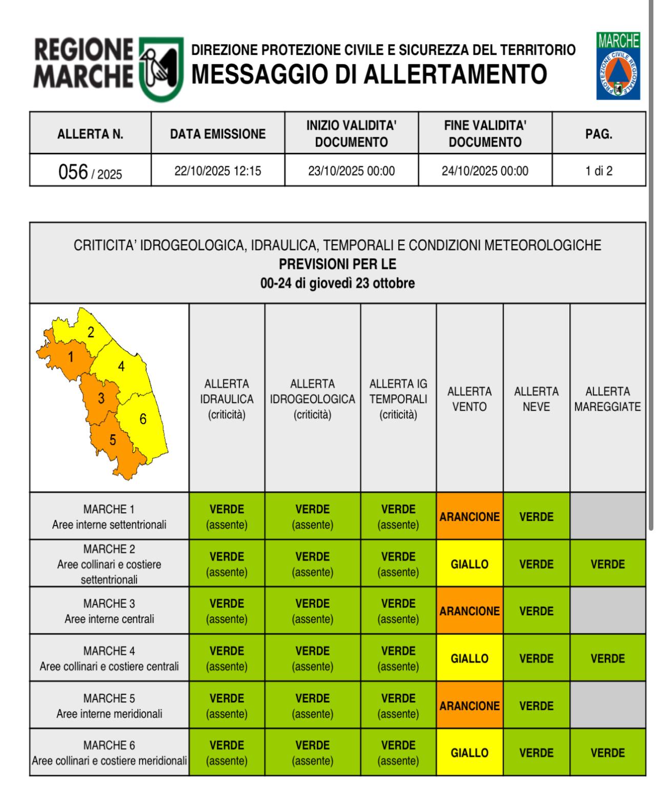 MARCHE – La Protezione Civile regionale ha diramato un’allerta meteo per vento valida in tutte le Marche per la giornata di giovedì 23 ottobre. I venti caldi e secchi provenienti dai rilievi saranno molto intensi dal primo pomeriggio fino a sera, con raffiche di tempesta violenta sui settori montani e alto-collinari e burrasca lungo la costa. L’allerta è di livello arancione per le aree interne e giallo per i settori collinari e costieri. La fase operativa indicata è quella di attenzione. La Protezione Civile invita alla prudenza, soprattutto per chi si sposta in auto o si trova in zone esposte al vento.